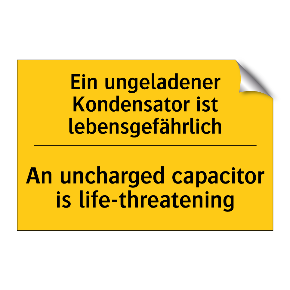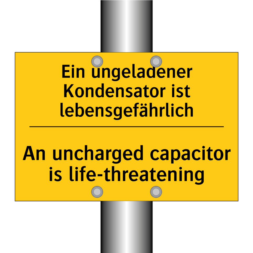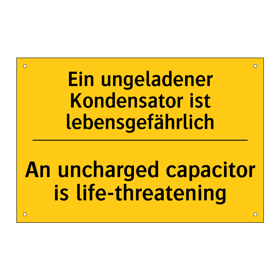 Zweisprachiges Warnschild mit deutschem Text Ein ungeladener Kondensator ist lebensgefährlich und englischem Text An uncharged capacitor is life-threatening
