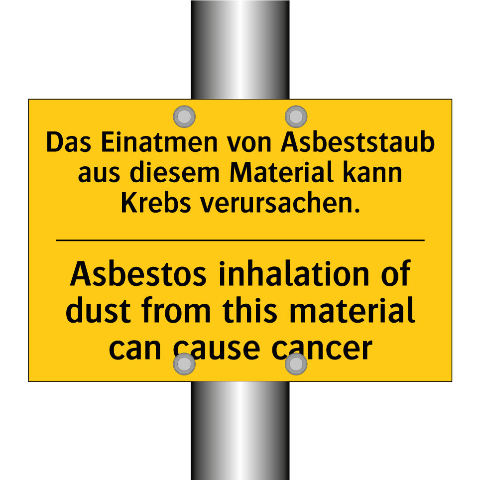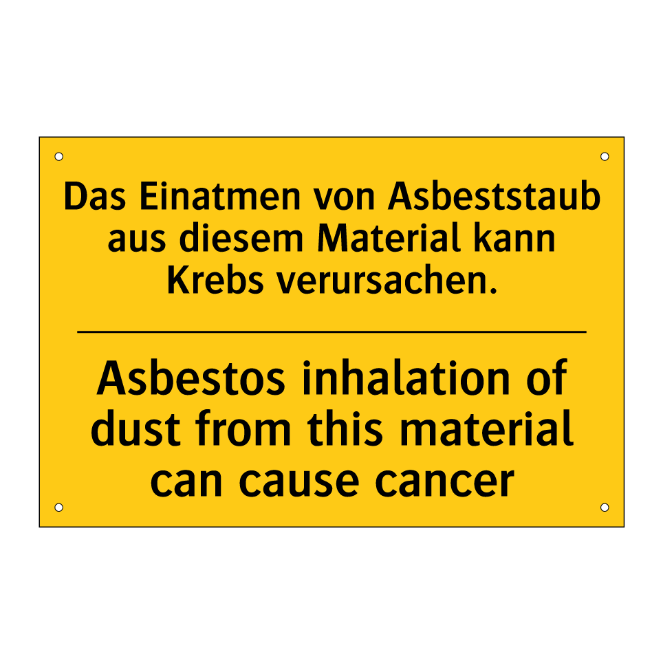 Zweisprachiges Warnschild mit deutschem Text Das Einatmen von Asbeststaub aus diesem Material kann Krebs verursachen. und englischem Text Asbestos inhalation of dust from this material can cause cancer