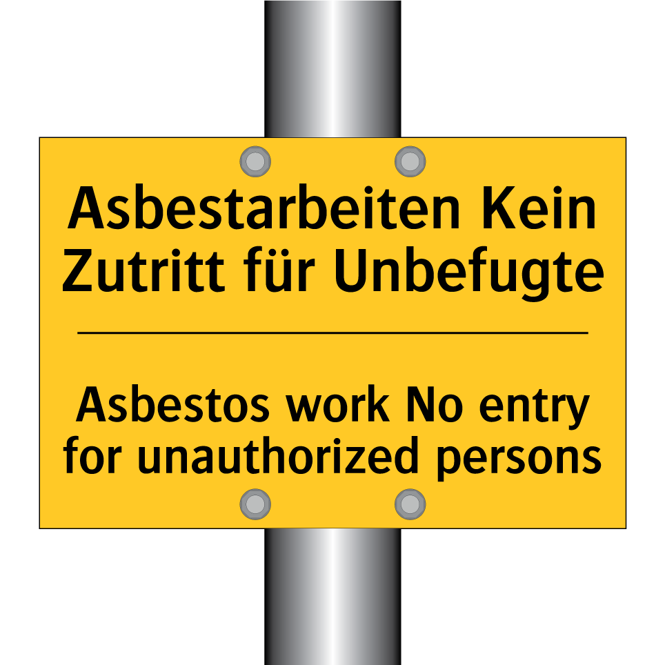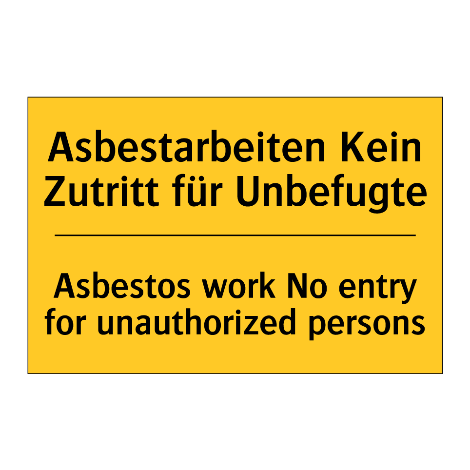 Zweisprachiges Warnschild mit deutschem Text Asbestarbeiten Kein Zutritt für Unbefugte und englischem Text Asbestos work No entry for unauthorized persons