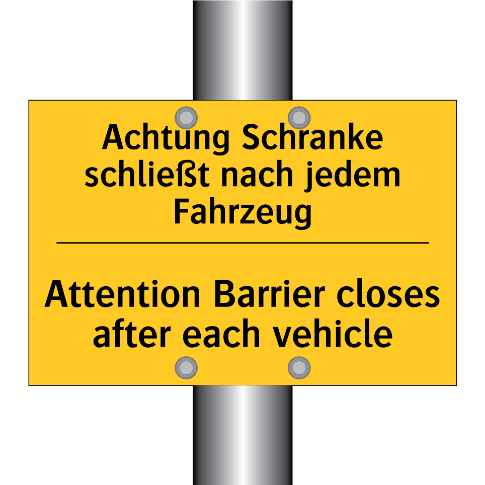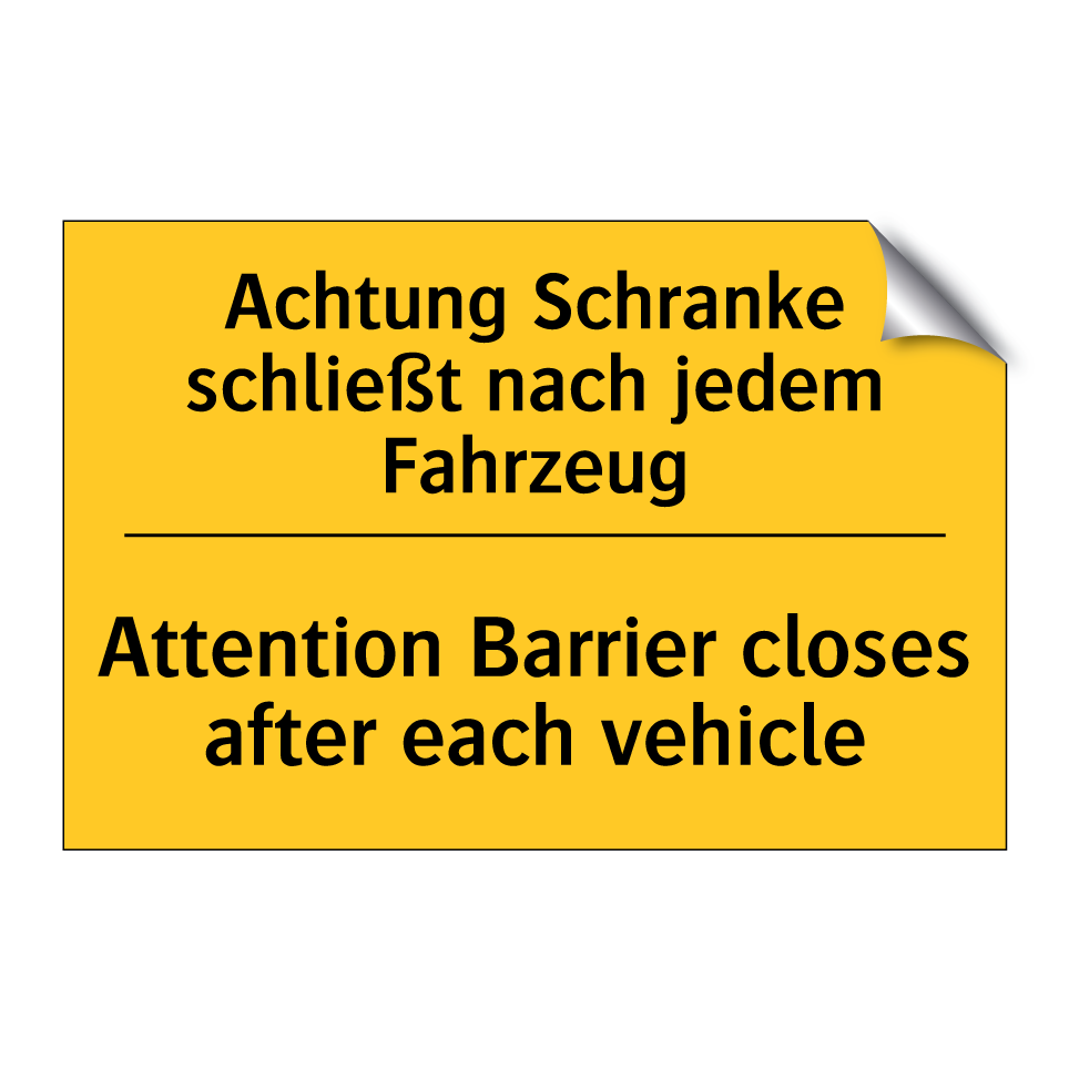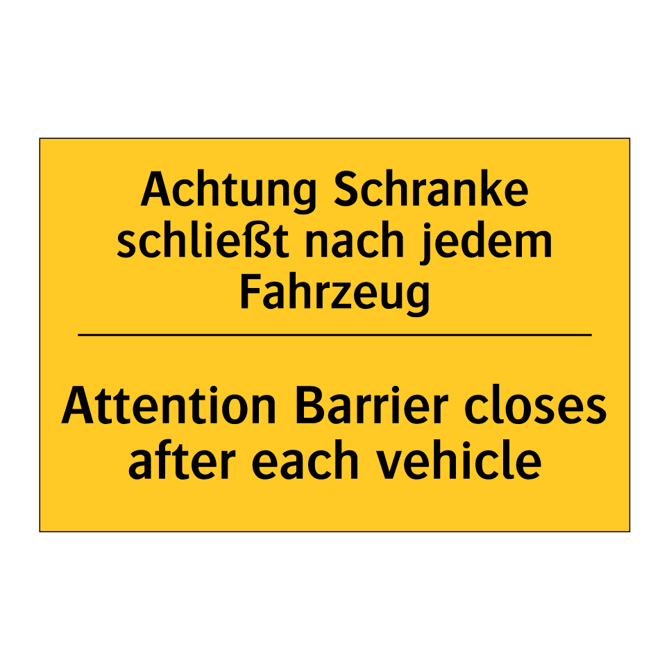 Zweisprachiges Warnschild mit deutschem Text Achtung Schranke schließt nach jedem Fahrzeug und englischem Text Attention Barrier closes after each vehicle