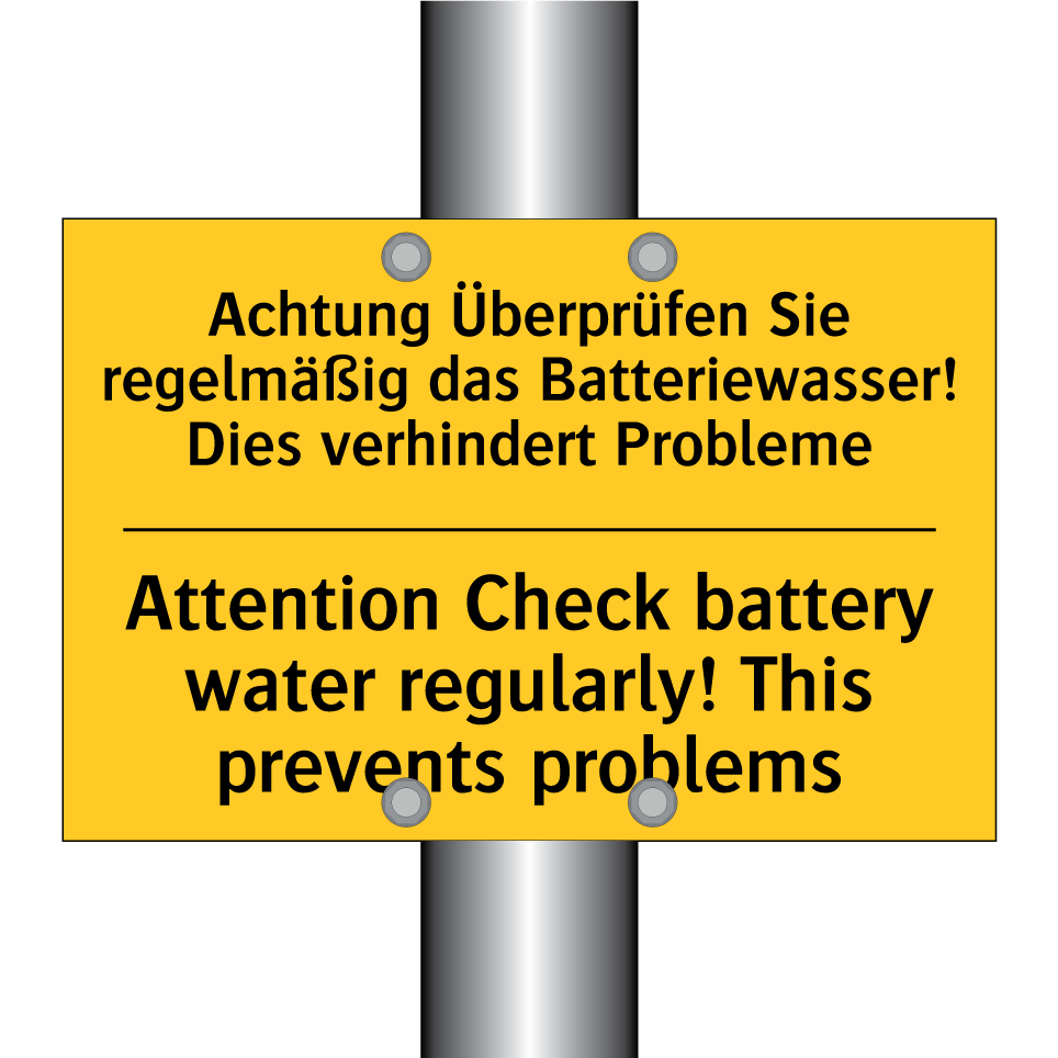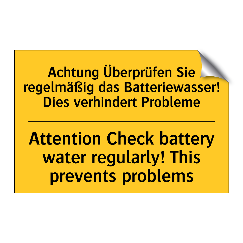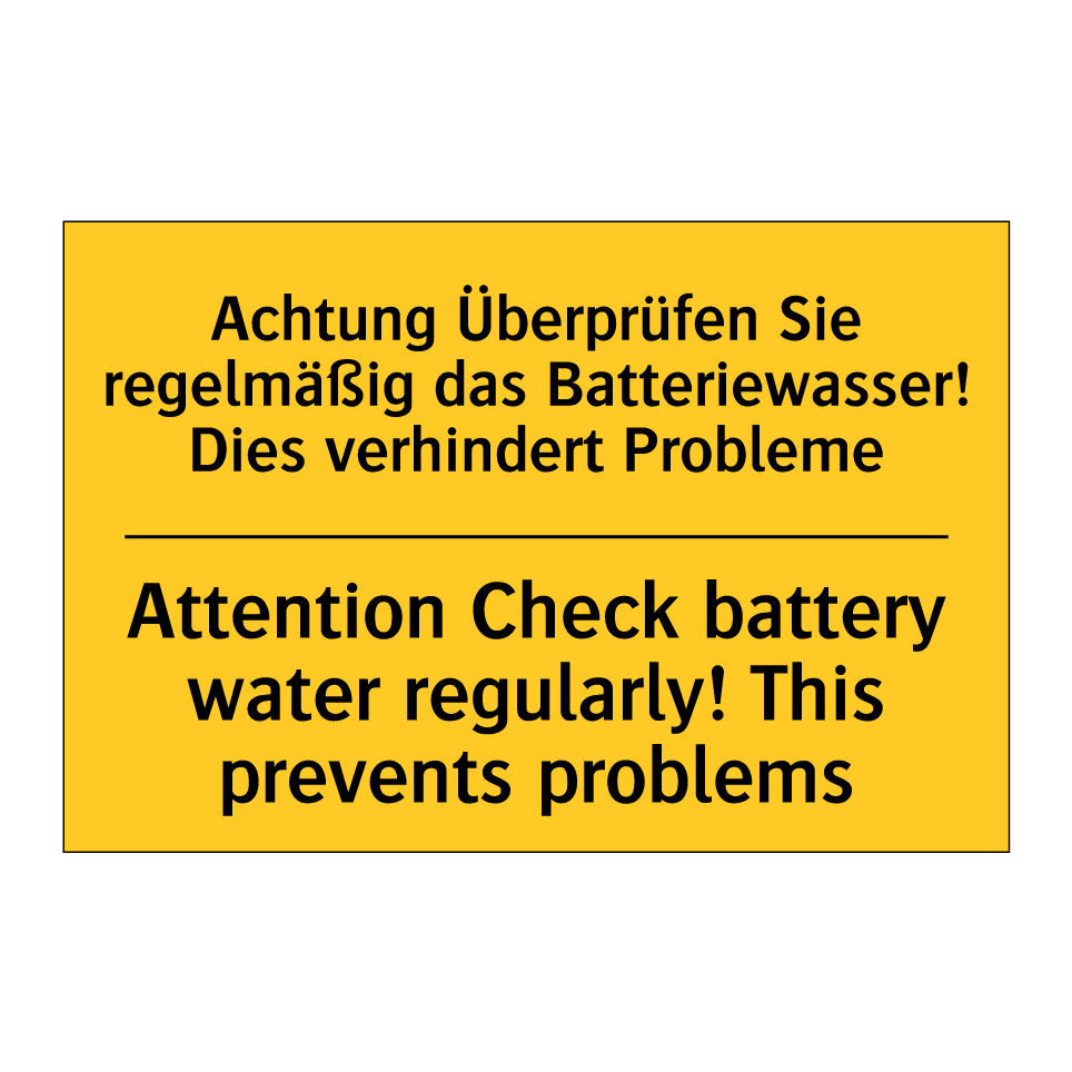 Zweisprachiges Warnschild mit deutschem Text Achtung Überprüfen Sie regelmäßig das Batteriewasser! Dies verhindert Probleme und englischem Text Attention Check battery water regularly! This prevents problems