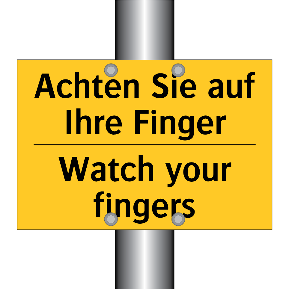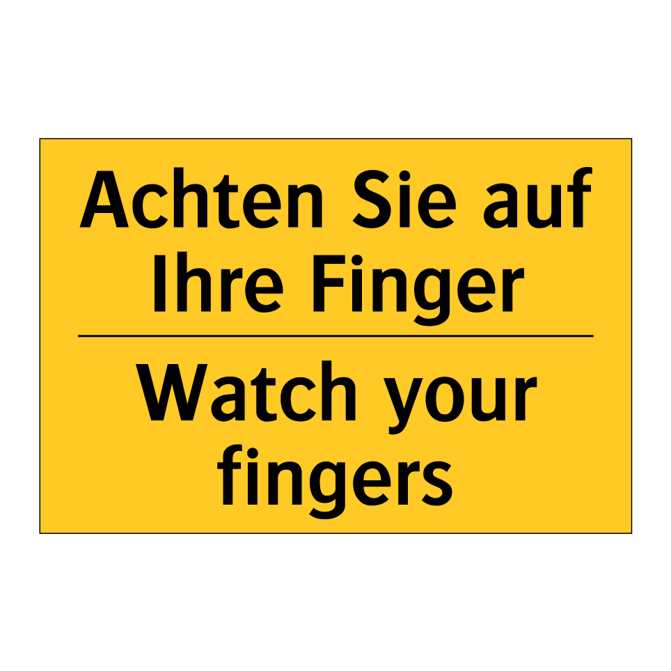 Zweisprachiges Warnschild mit deutschem Text Achten Sie auf Ihre Finger und englischem Text Watch your fingers