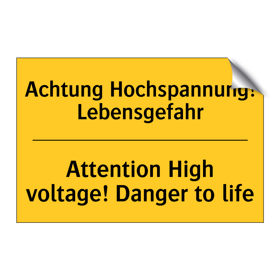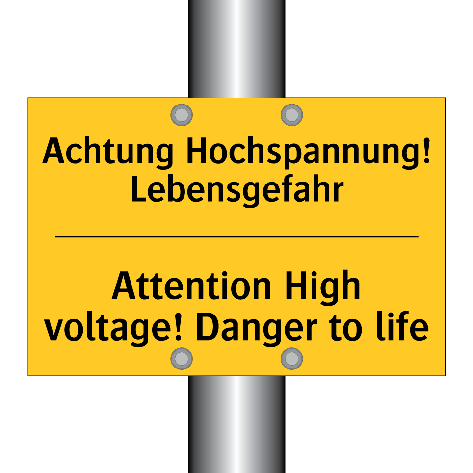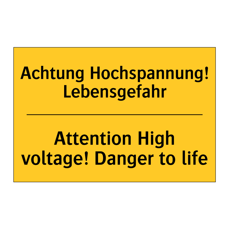 Zweisprachiges Warnschild mit deutschem Text Achtung Hochspannung! Lebensgefahr und englischem Text Attention High voltage! Danger to life
