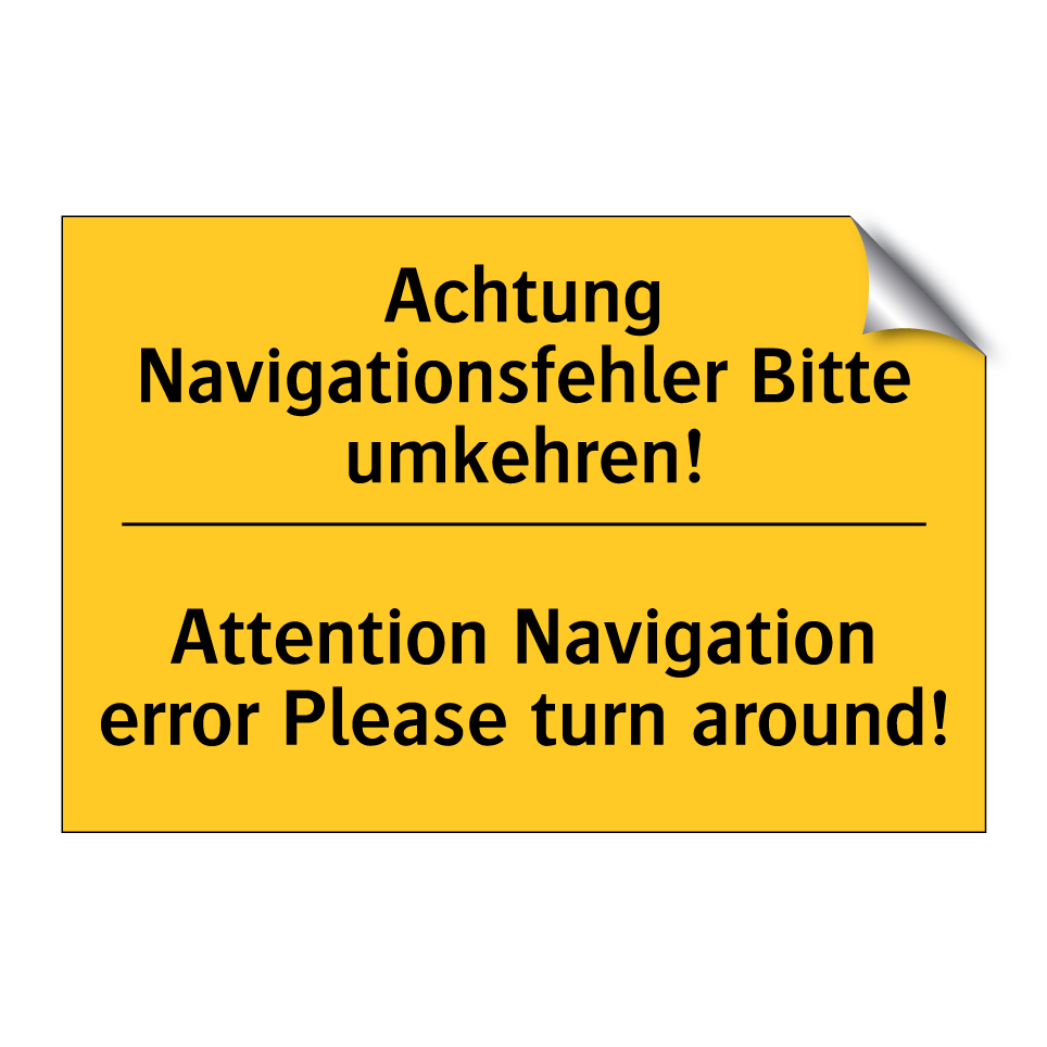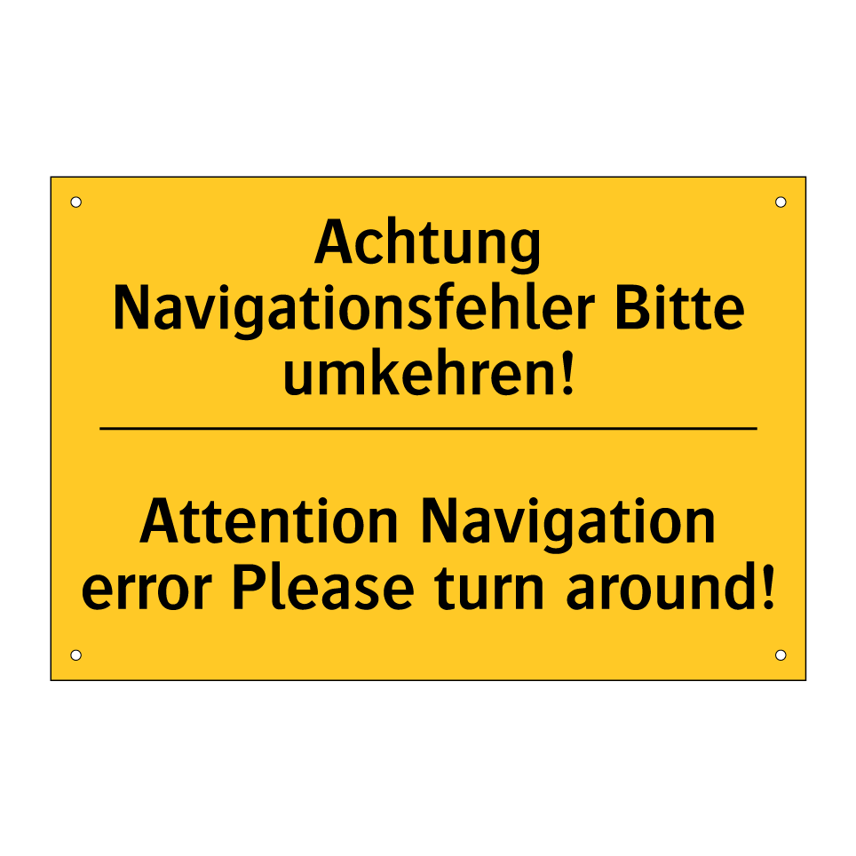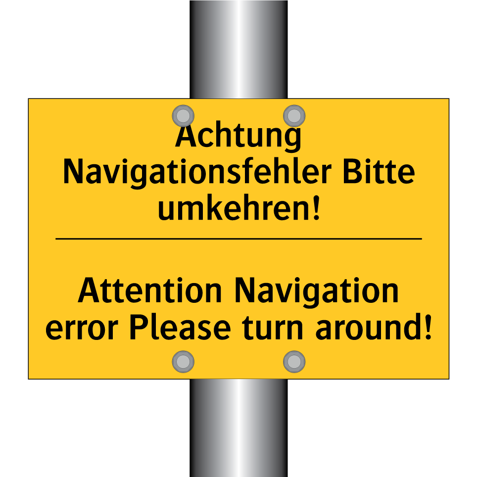 Zweisprachiges Warnschild mit deutschem Text Achtung Navigationsfehler Bitte umkehren! und englischem Text Attention Navigation error Please turn around!
