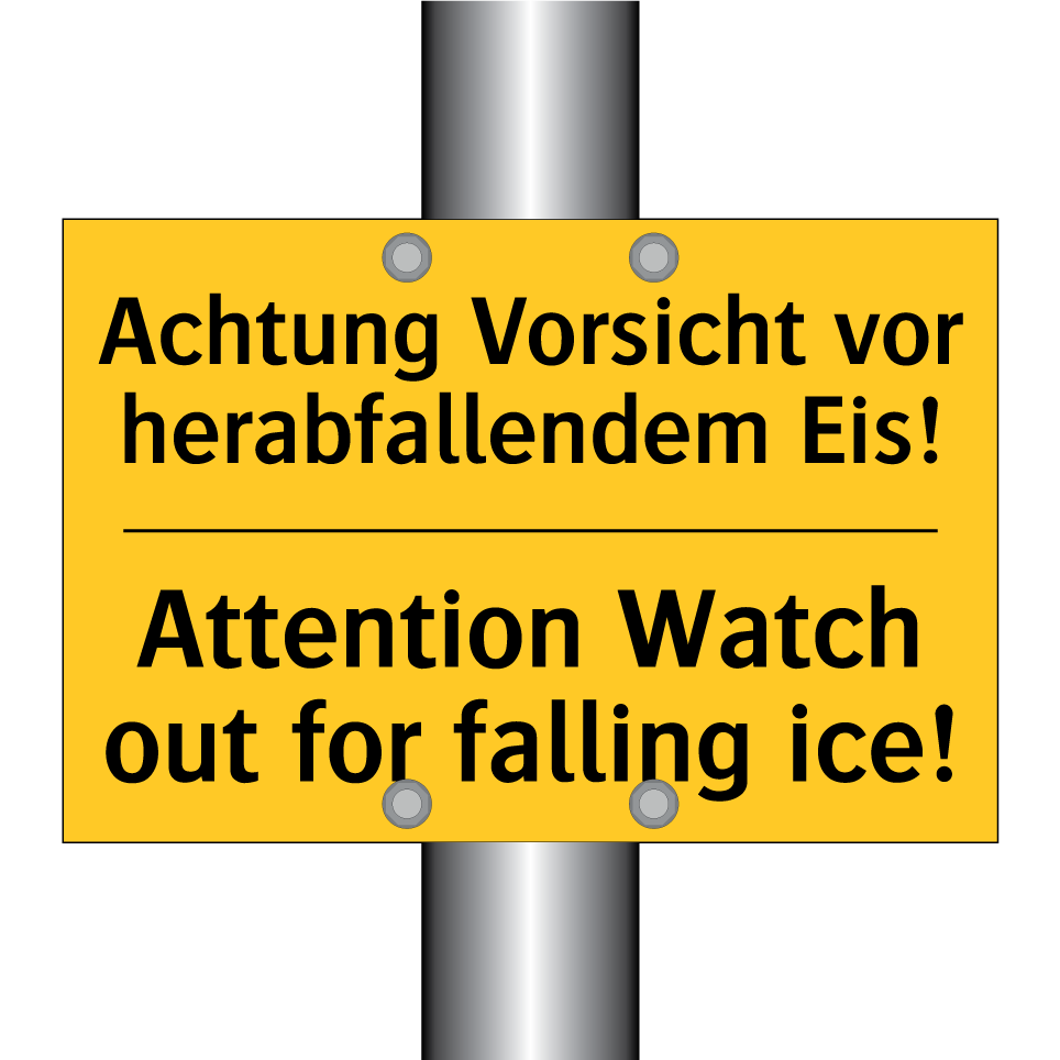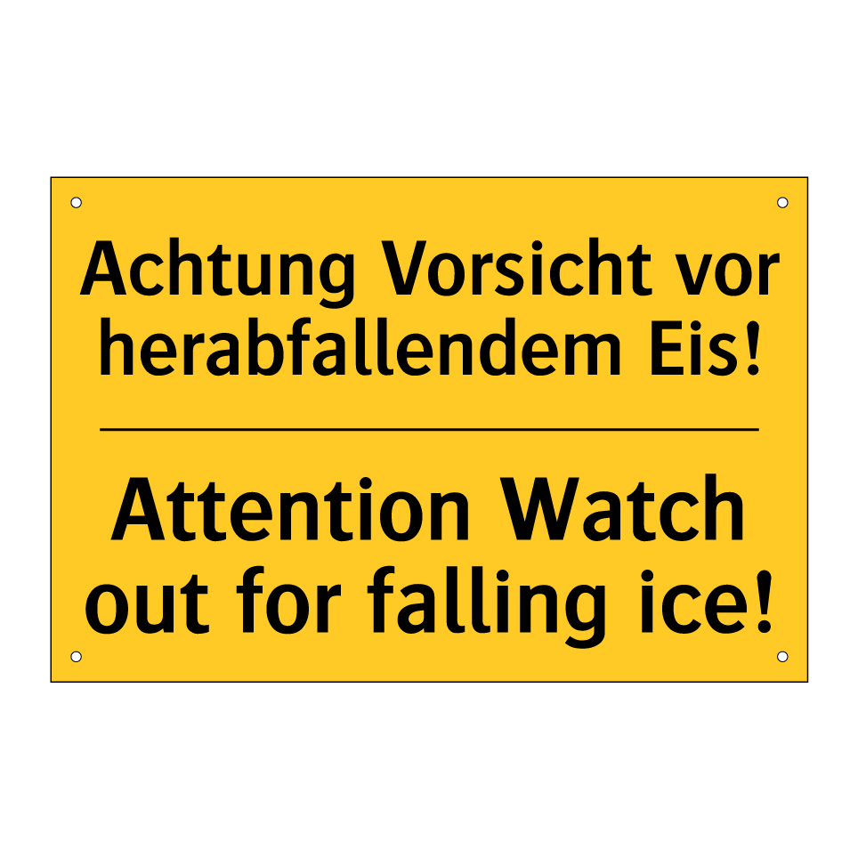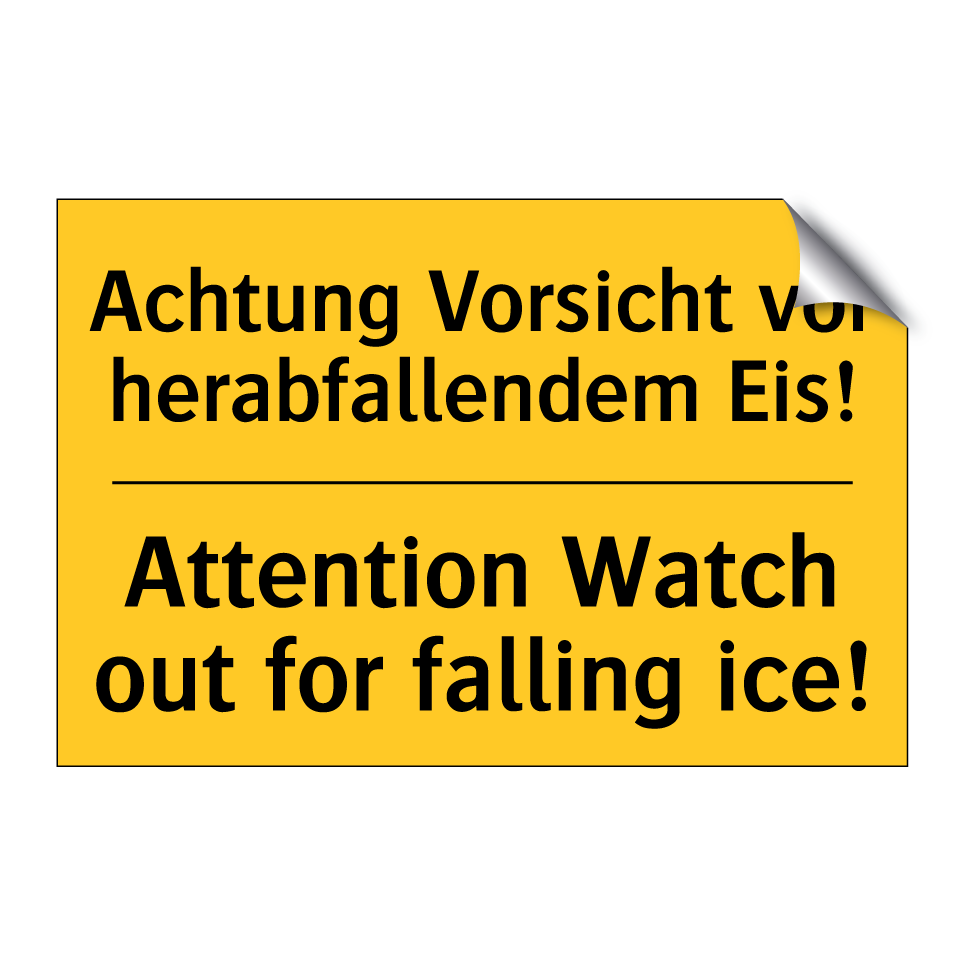 Zweisprachiges Warnschild mit deutschem Text Achtung Vorsicht vor herabfallendem Eis! und englischem Text Attention Watch out for falling ice!