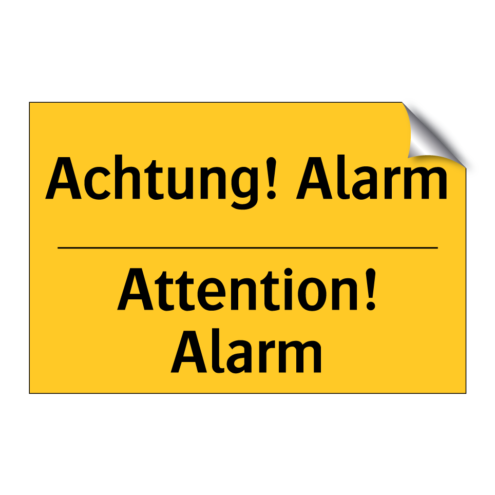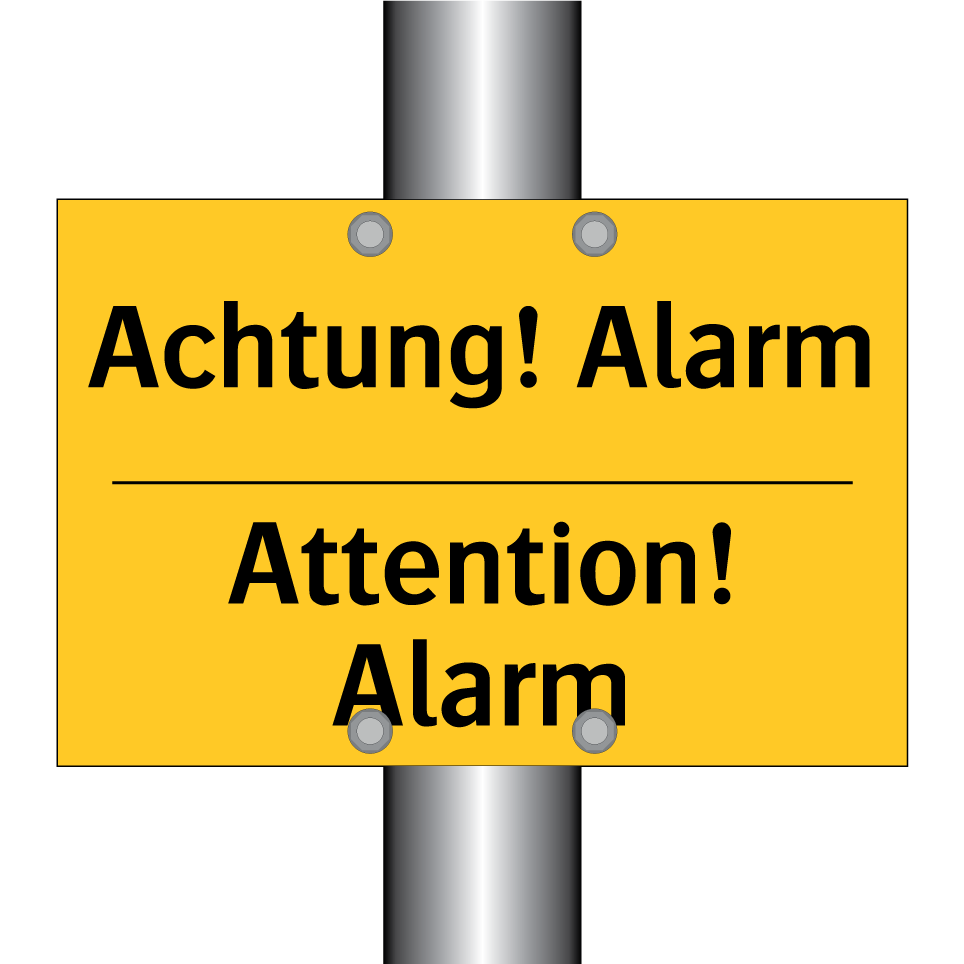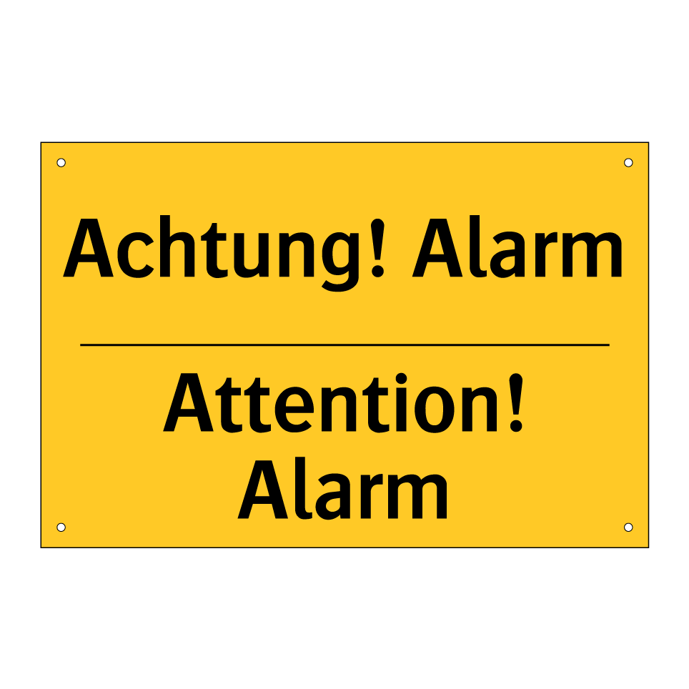 Zweisprachiges Warnschild mit deutschem Text Achtung! Alarm und englischem Text Attention! Alarm