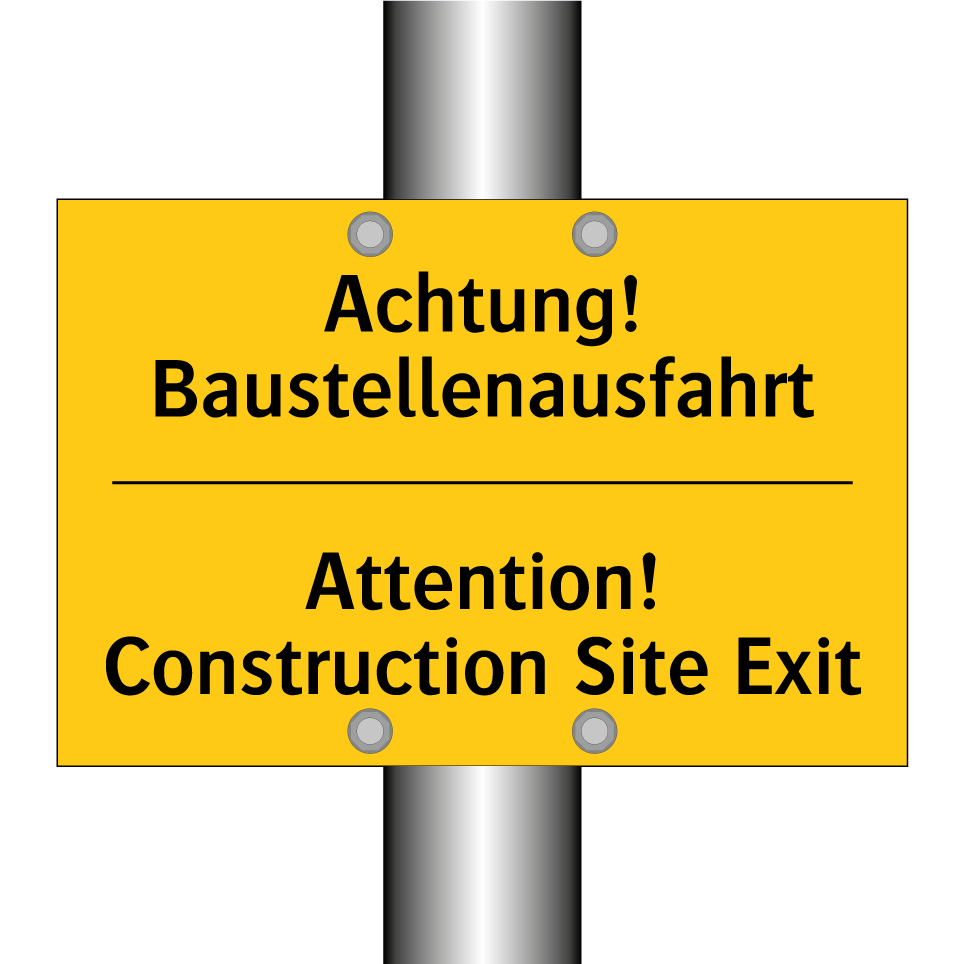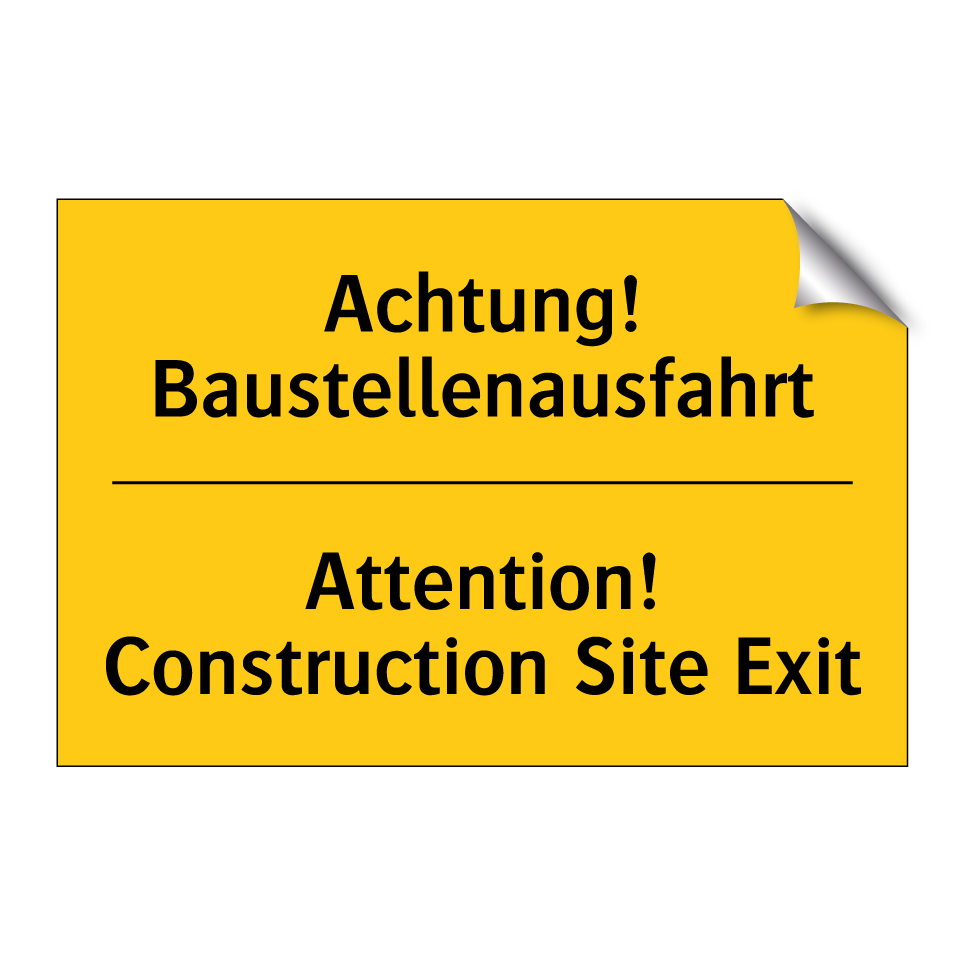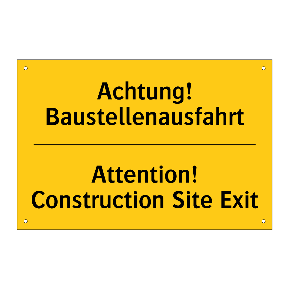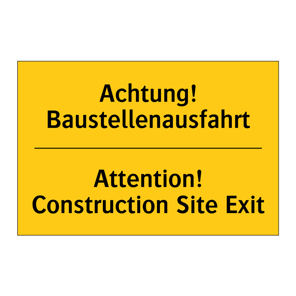 Zweisprachiges Warnschild mit deutschem Text Achtung! Baustellenausfahrt und englischem Text Attention! Construction Site Exit