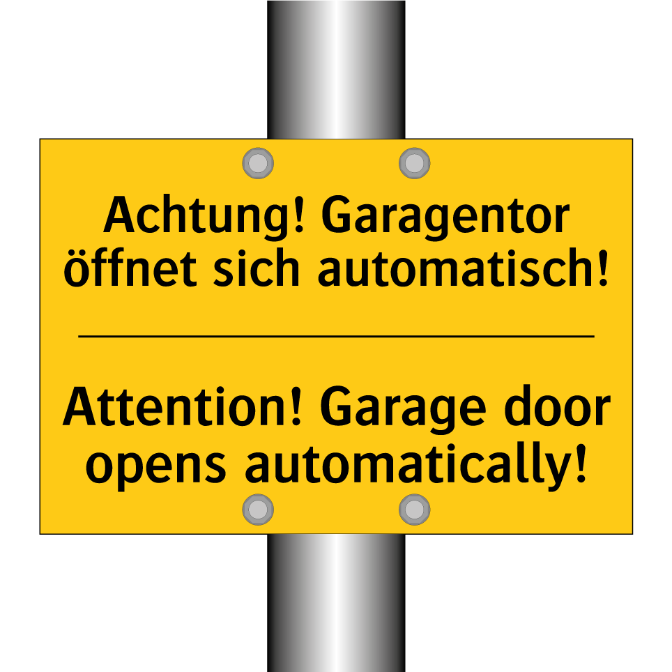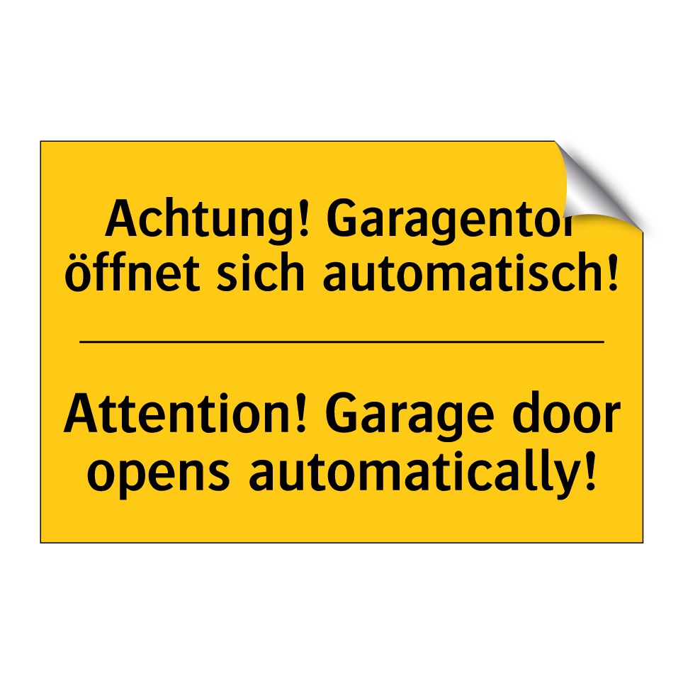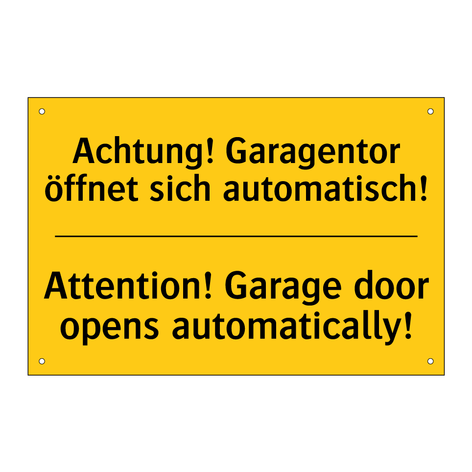 Zweisprachiges Warnschild mit deutschem Text Achtung! Garagentor öffnet sich automatisch! und englischem Text Attention! Garage door opens automatically!