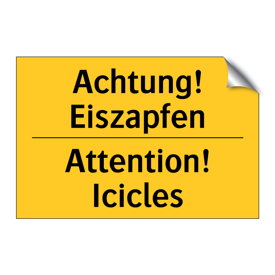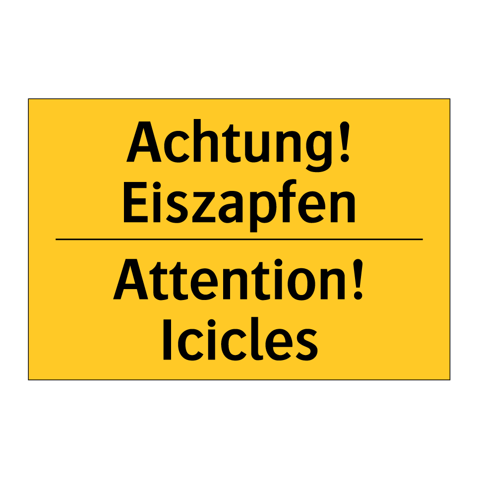 Zweisprachiges Warnschild mit deutschem Text Achtung! Eiszapfen und englischem Text Attention! Icicles