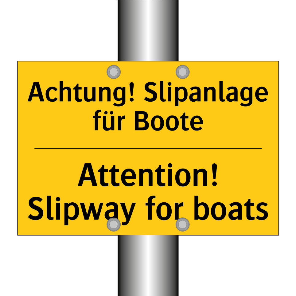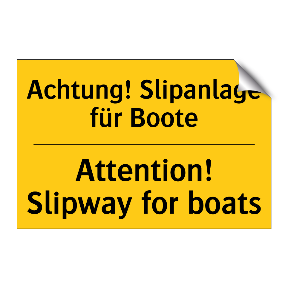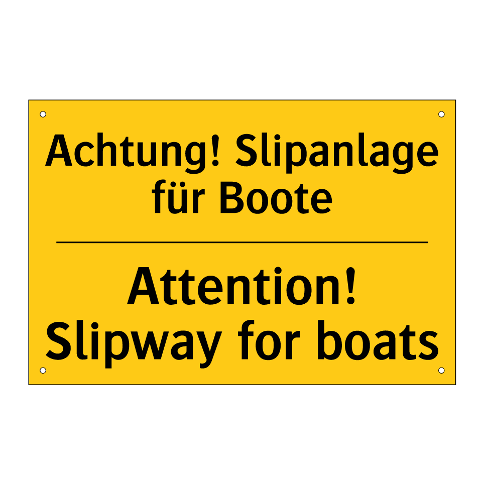 Zweisprachiges Warnschild mit deutschem Text Achtung! Slipanlage für Boote und englischem Text Attention! Slipway for boats