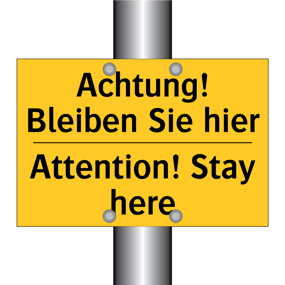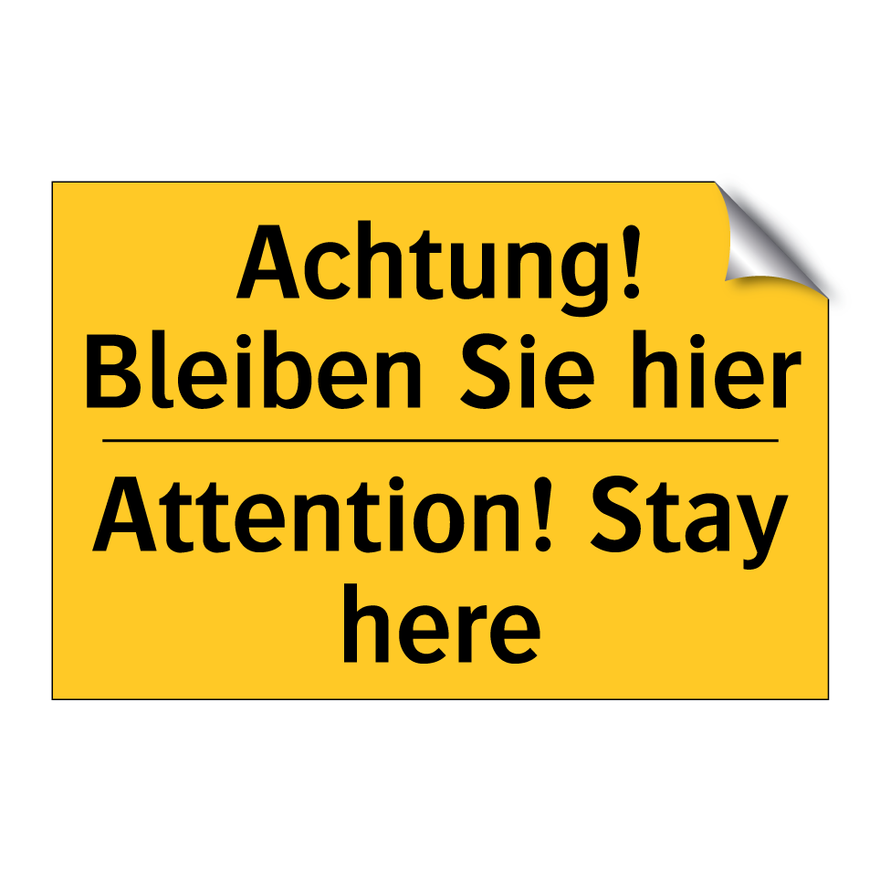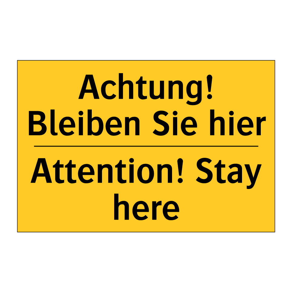 Zweisprachiges Warnschild mit deutschem Text Achtung! Bleiben Sie hier und englischem Text Attention! Stay here
