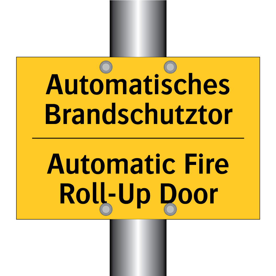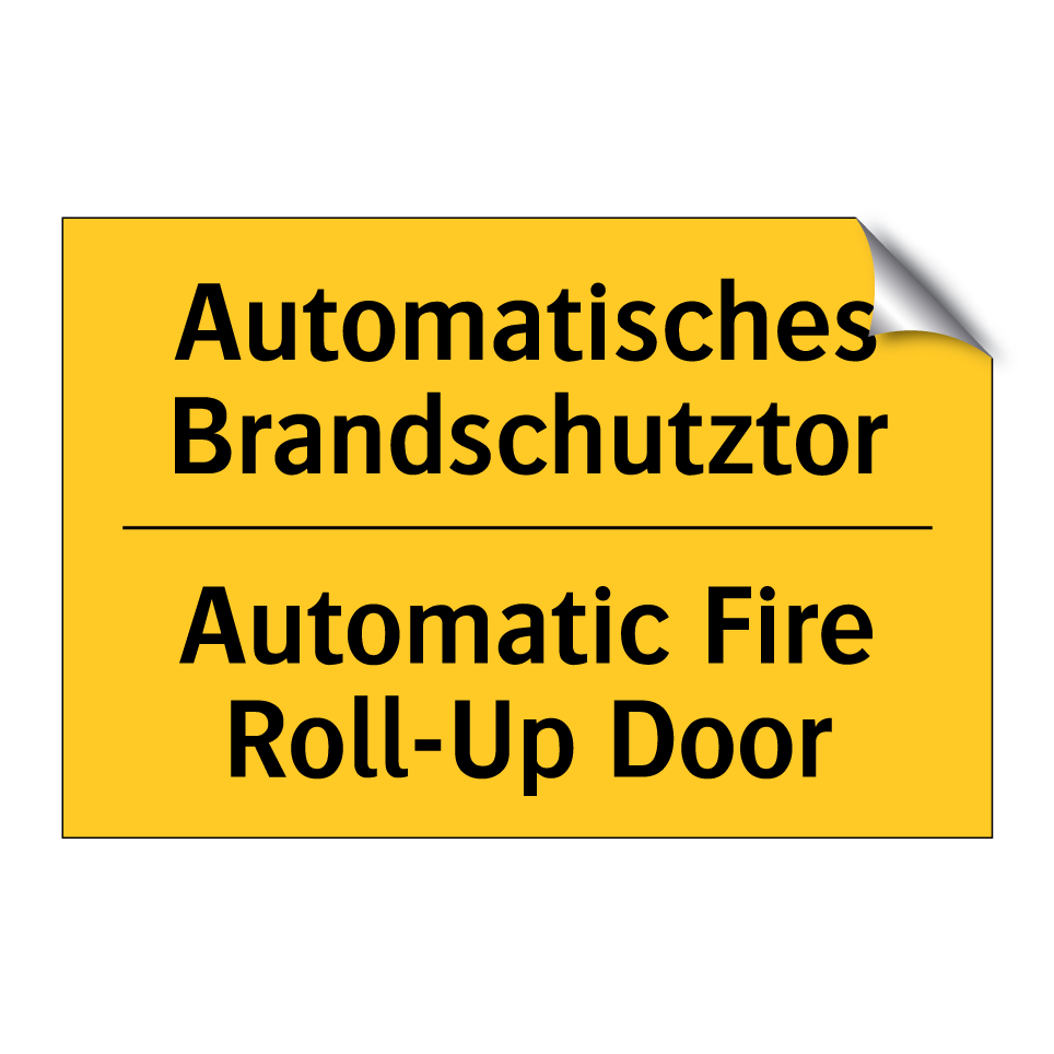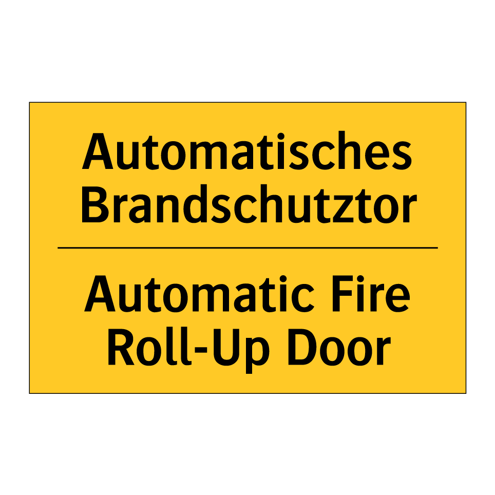 Zweisprachiges Warnschild mit deutschem Text Automatisches Brandschutztor und englischem Text Automatic Fire Roll-Up Door