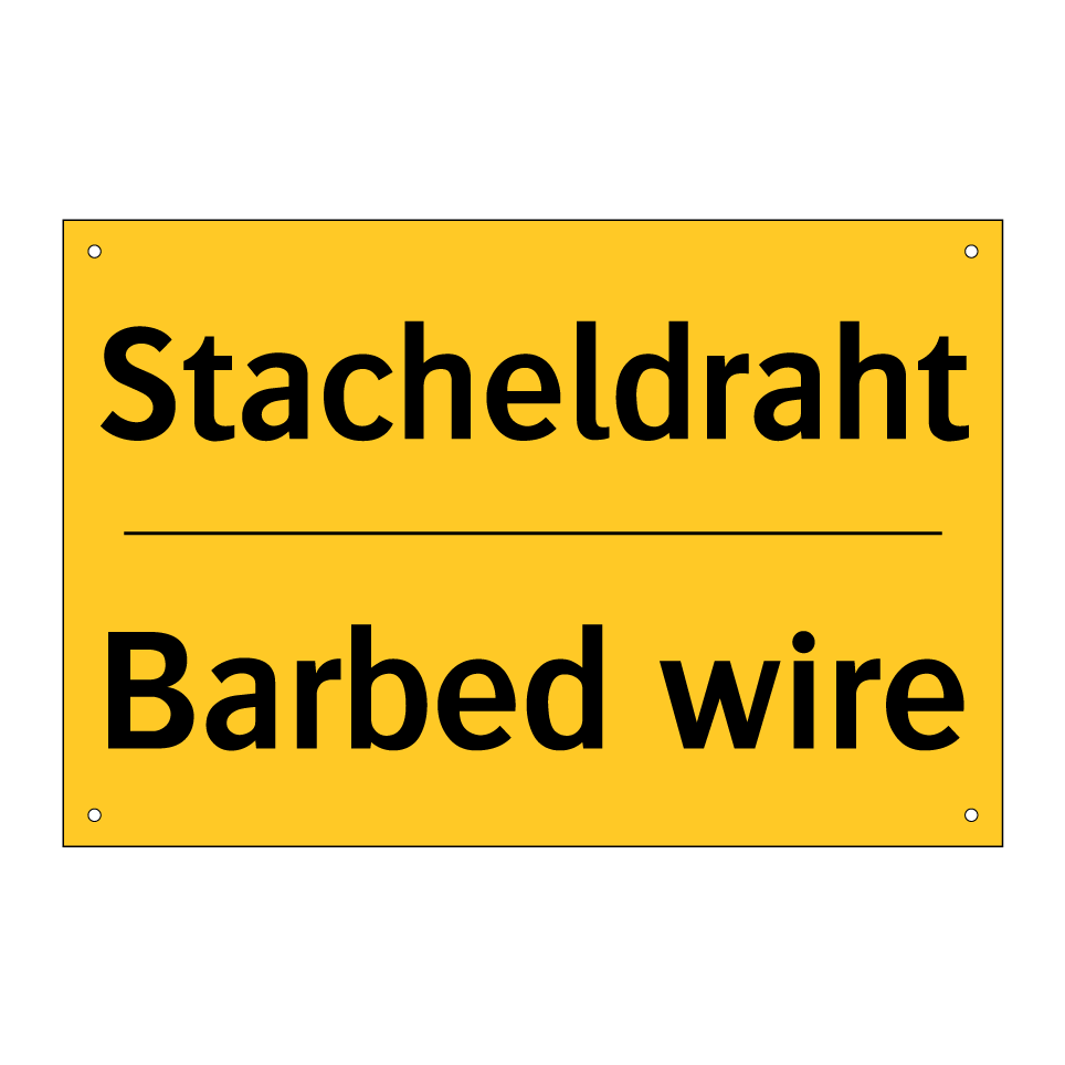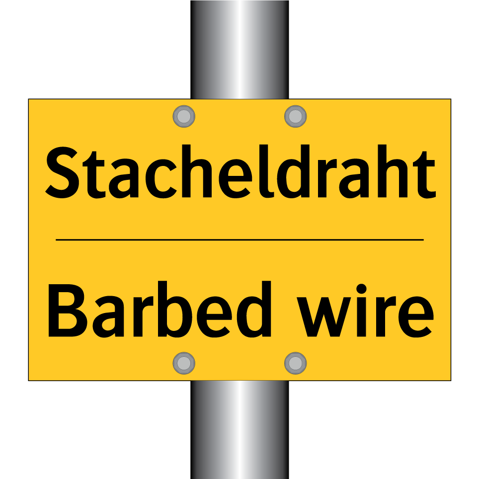 Zweisprachiges Warnschild mit deutschem Text Stacheldraht und englischem Text Barbed wire