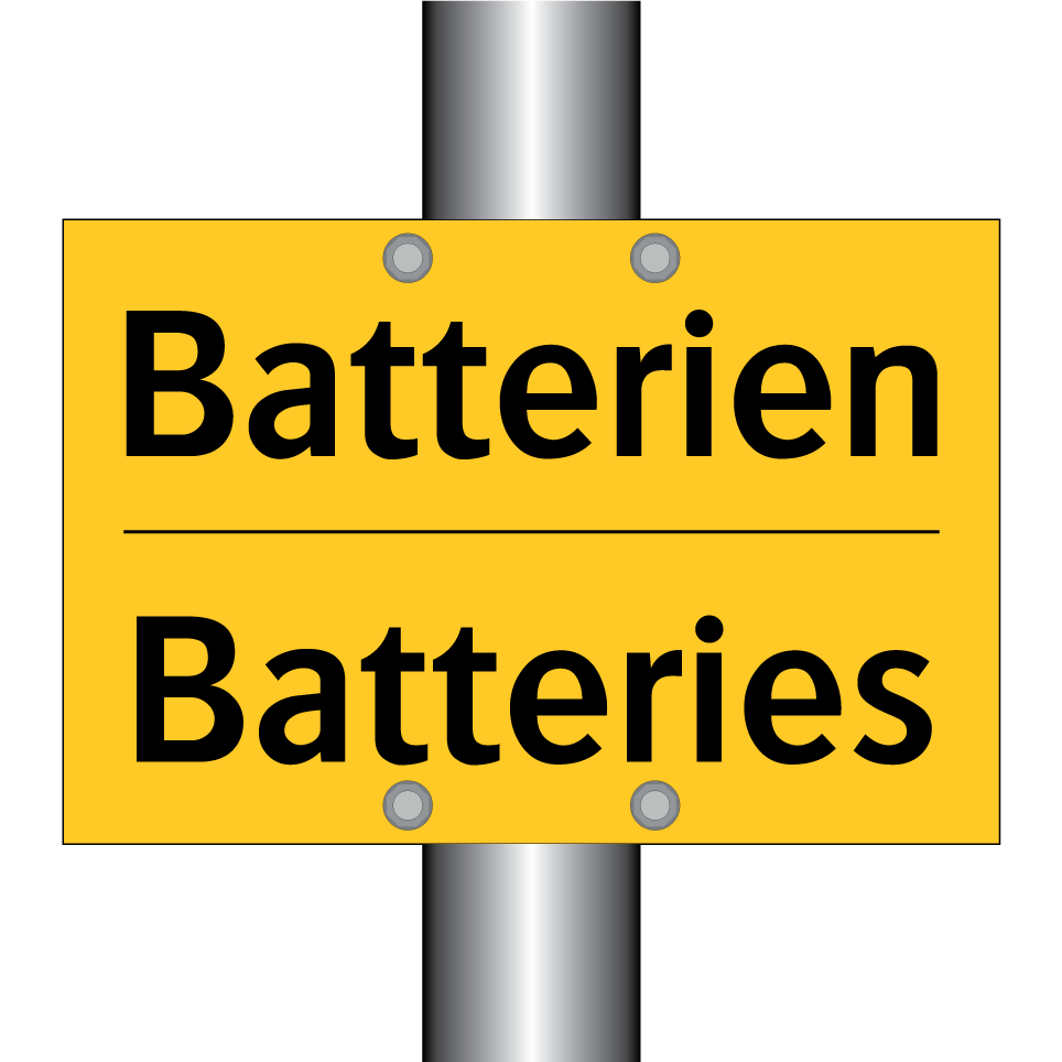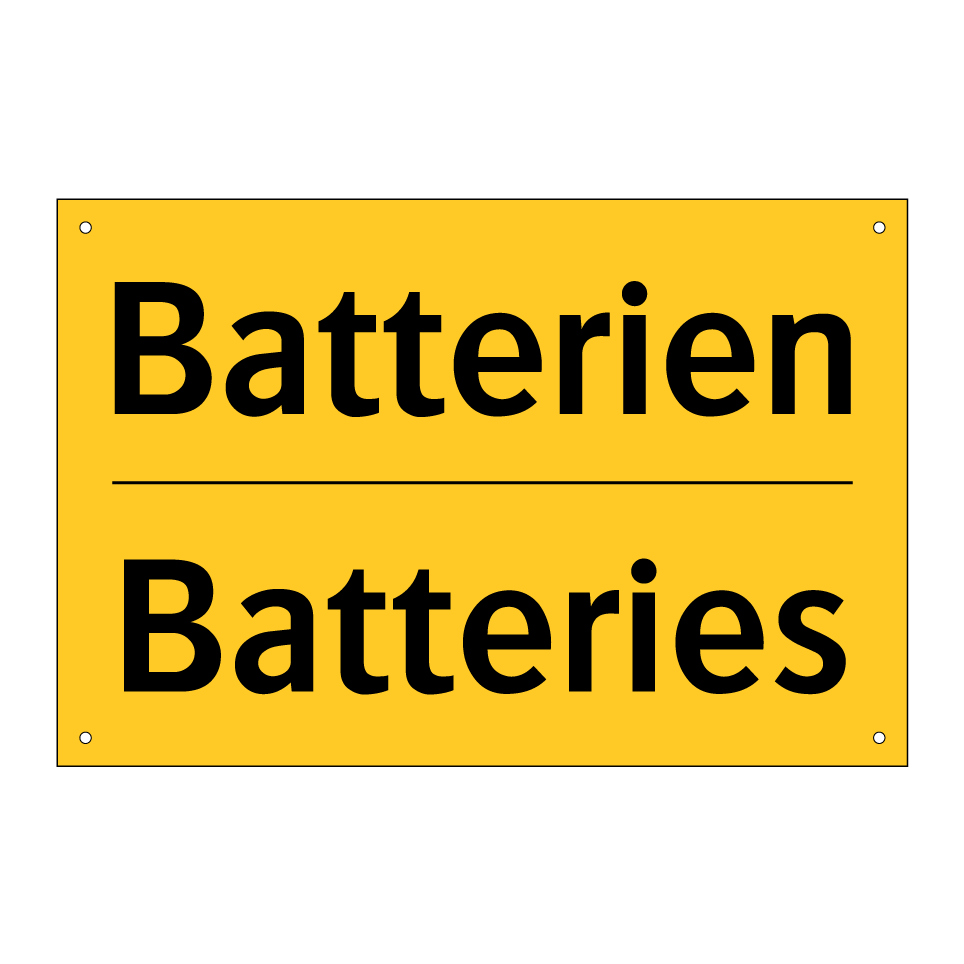 Zweisprachiges Warnschild mit deutschem Text Batterien und englischem Text Batteries