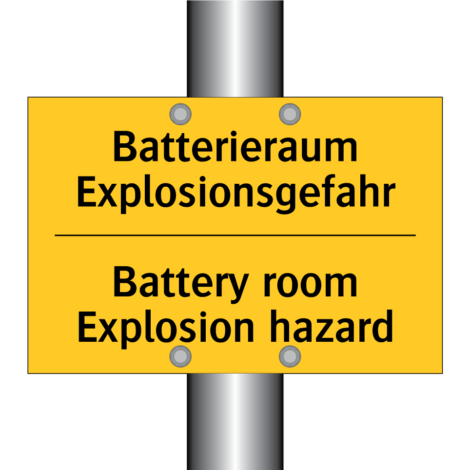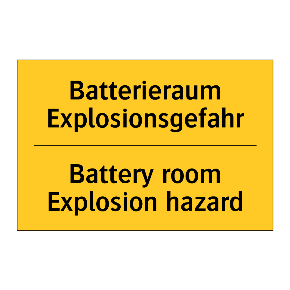 Zweisprachiges Warnschild mit deutschem Text Batterieraum Explosionsgefahr und englischem Text Battery room Explosion hazard