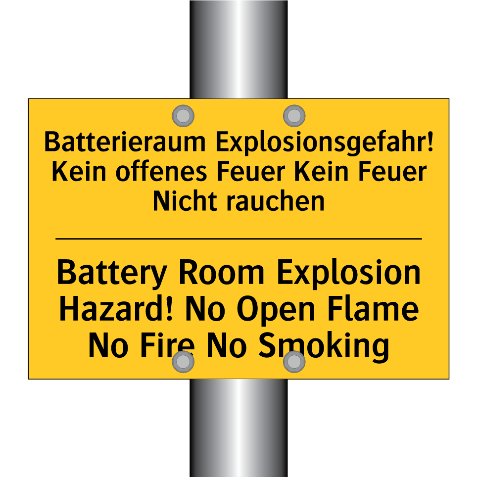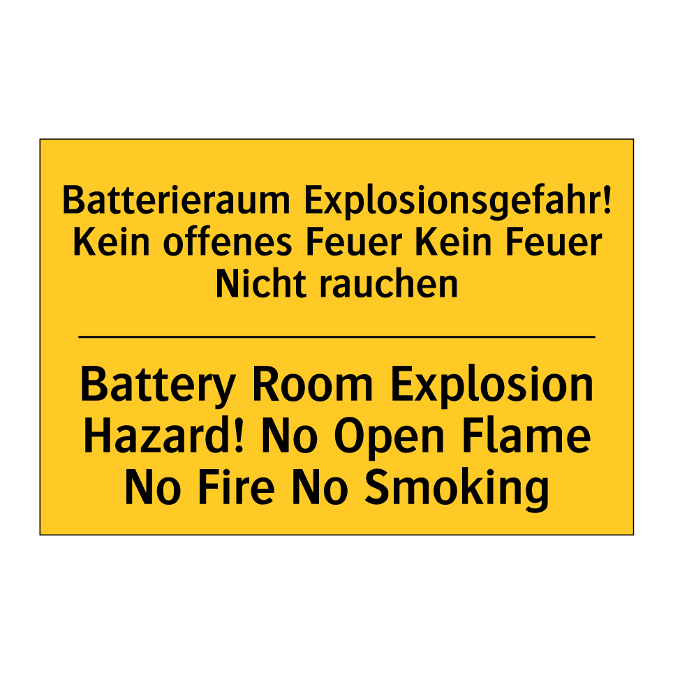 Zweisprachiges Warnschild mit deutschem Text Batterieraum Explosionsgefahr! Kein offenes Feuer Kein Feuer Nicht rauchen und englischem Text Battery Room Explosion Hazard! No Open Flame No Fire No Smoking