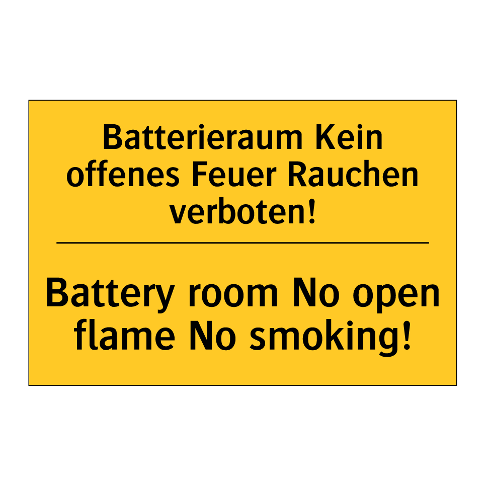Zweisprachiges Warnschild mit deutschem Text Batterieraum Kein offenes Feuer Rauchen verboten! und englischem Text Battery room No open flame No smoking!