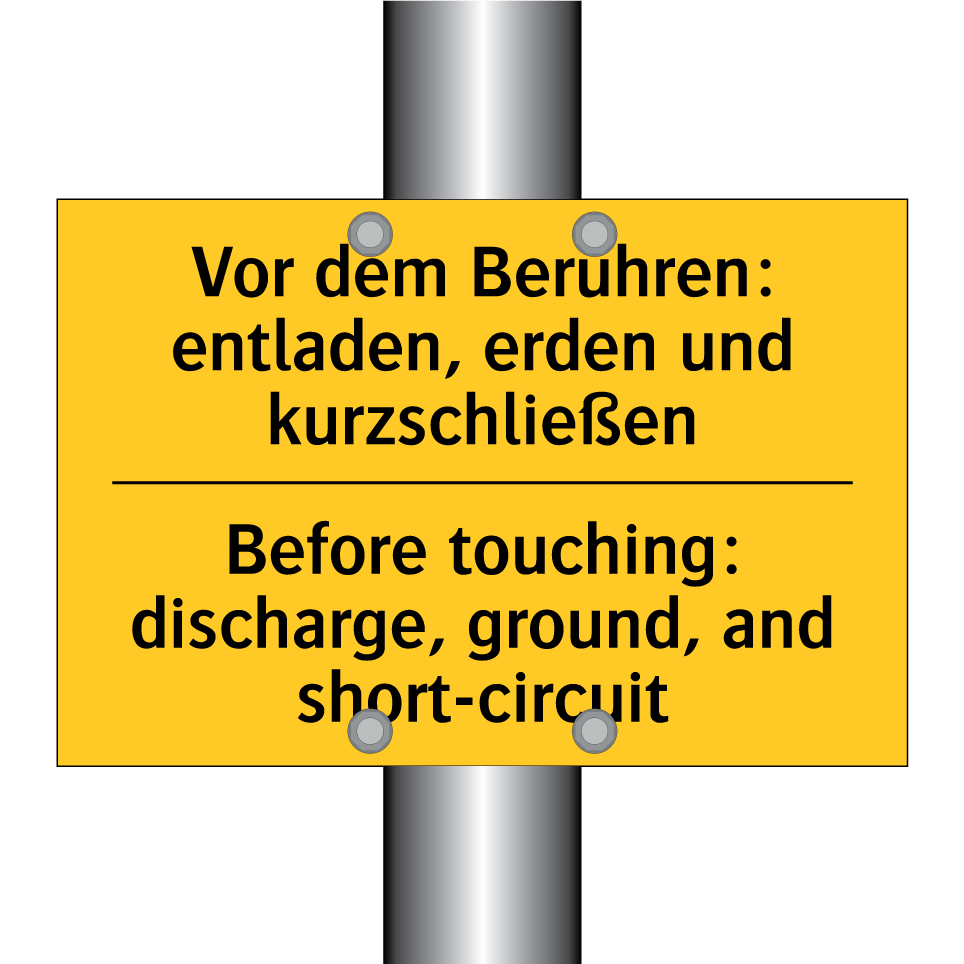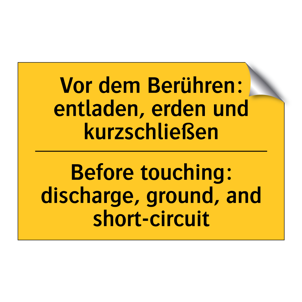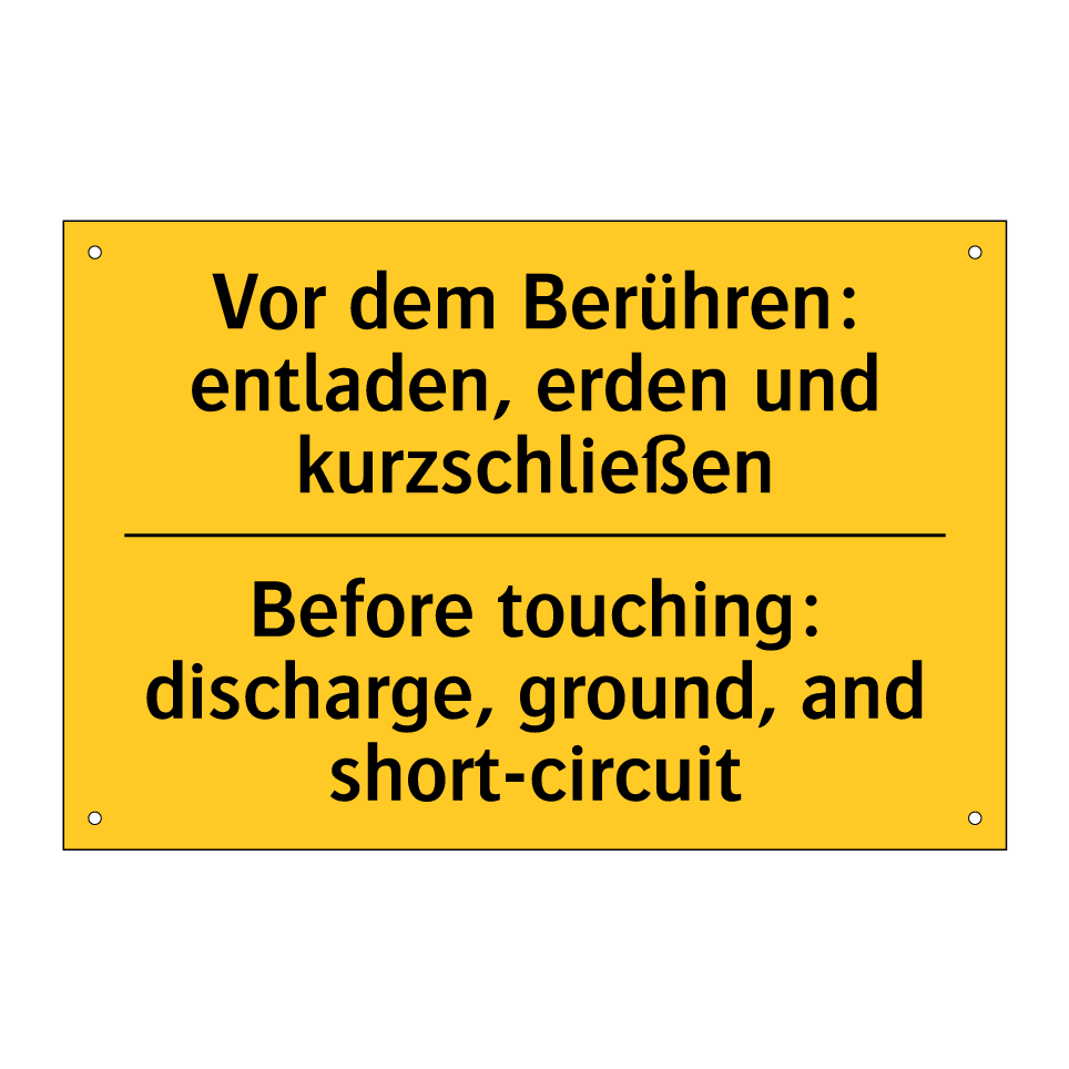 Zweisprachiges Warnschild mit deutschem Text Vor dem Berühren: entladen, erden und kurzschließen und englischem Text Before touching: discharge, ground, and short-circuit