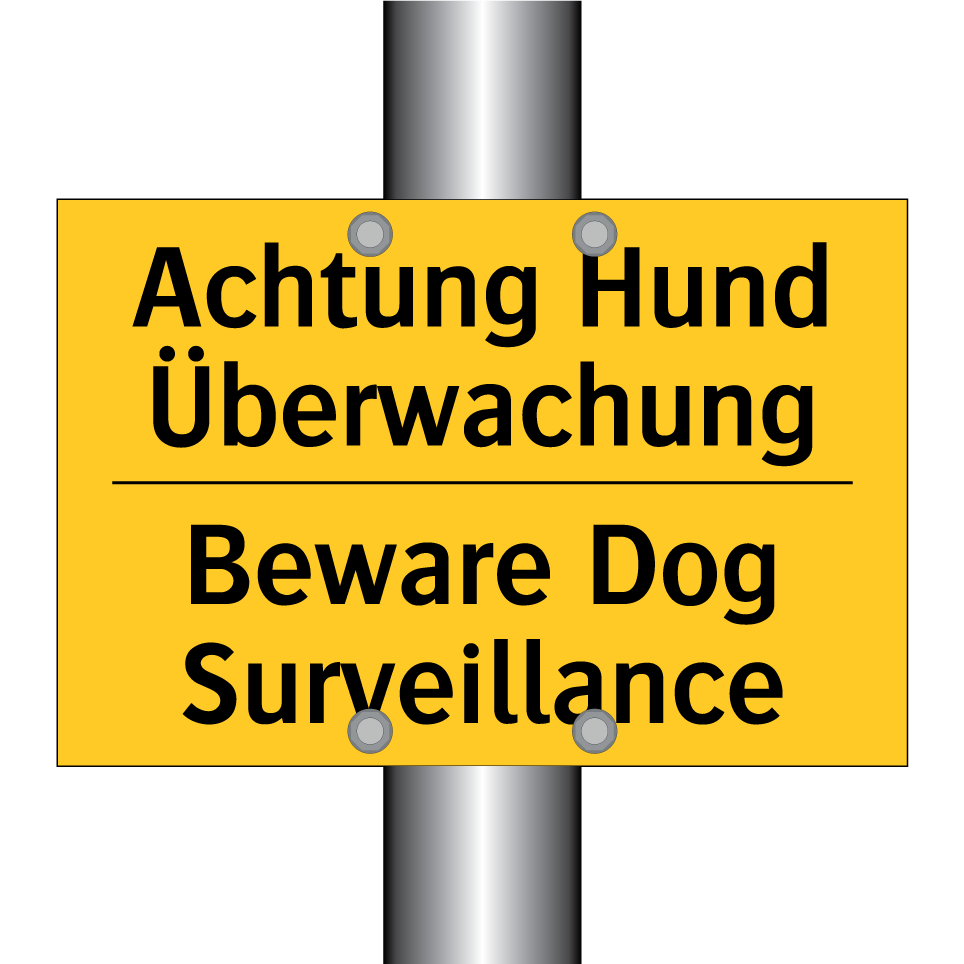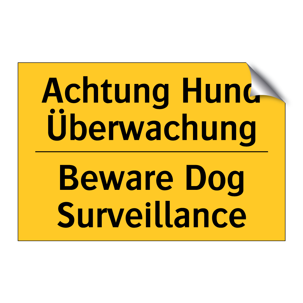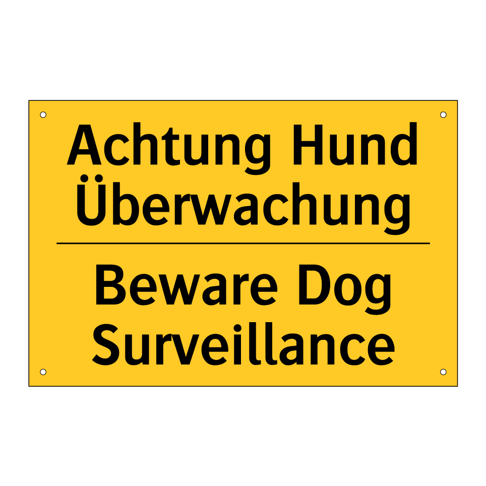 Zweisprachiges Warnschild mit deutschem Text Achtung Hund Überwachung und englischem Text Beware Dog Surveillance