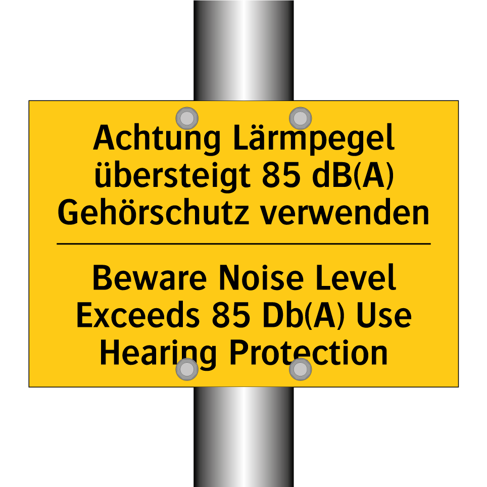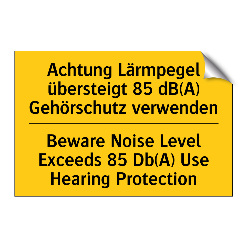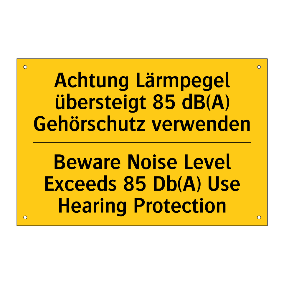 Zweisprachiges Warnschild mit deutschem Text Achtung Lärmpegel übersteigt 85 dB(A) Gehörschutz verwenden und englischem Text Beware Noise Level Exceeds 85 Db(A) Use Hearing Protection