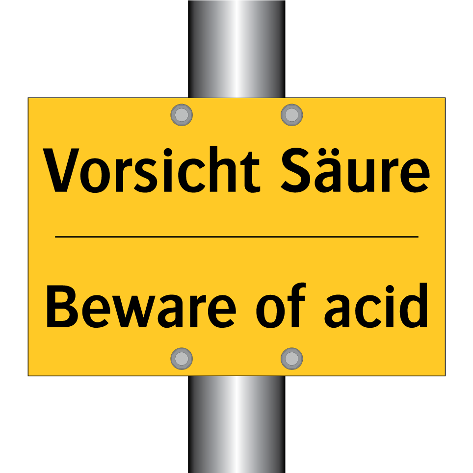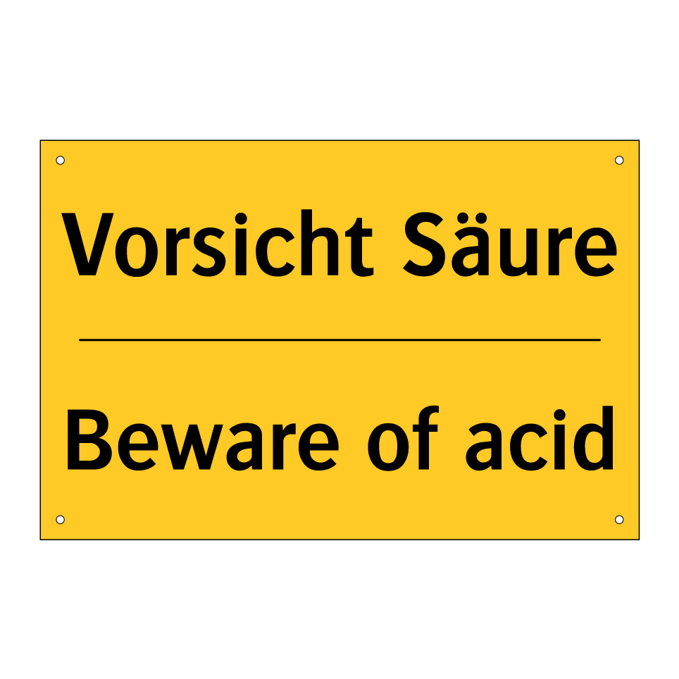 Zweisprachiges Warnschild mit deutschem Text Vorsicht Säure und englischem Text Beware of acid