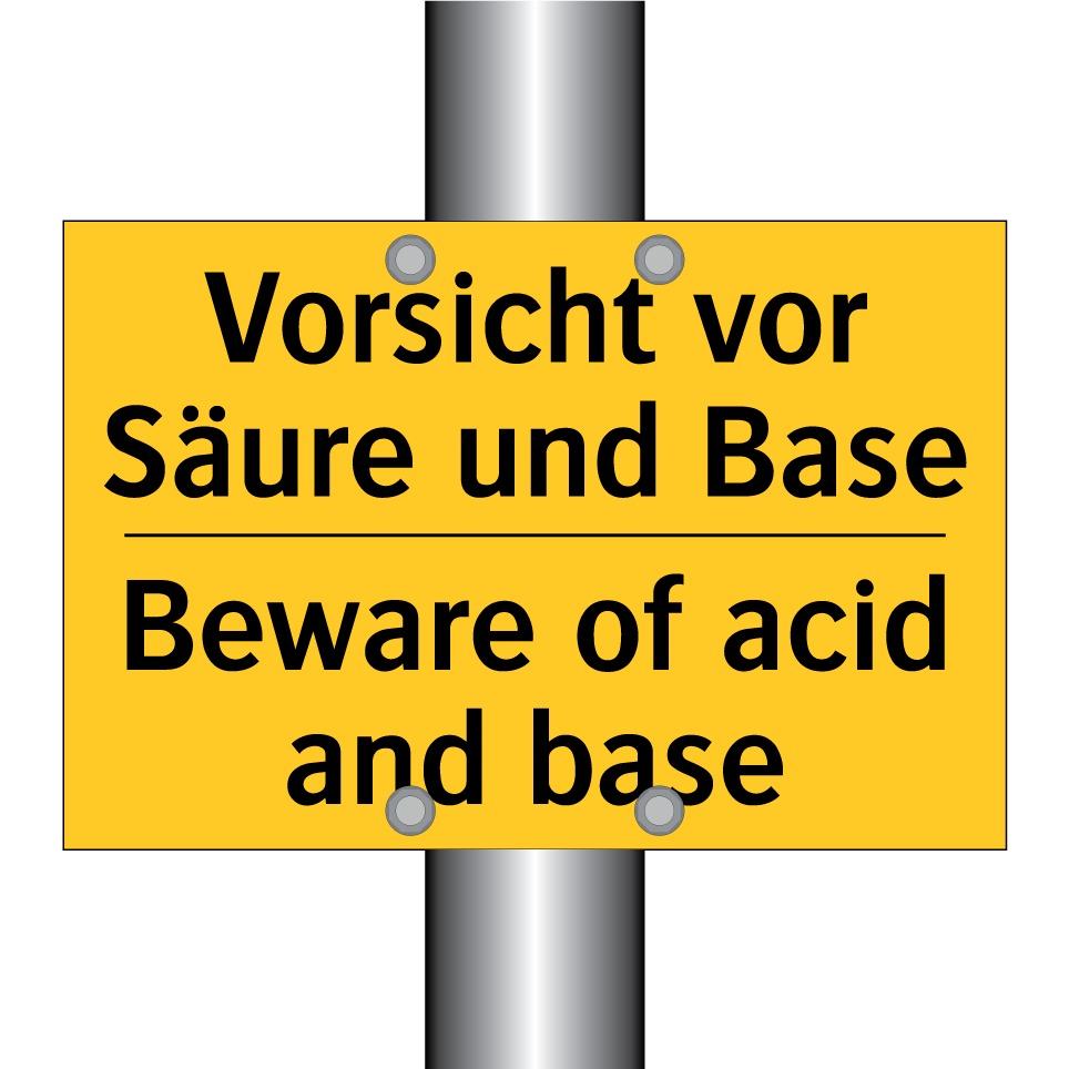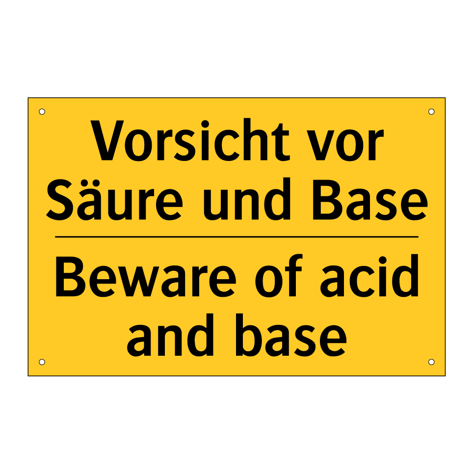 Zweisprachiges Warnschild mit deutschem Text Vorsicht vor Säure und Base und englischem Text Beware of acid and base