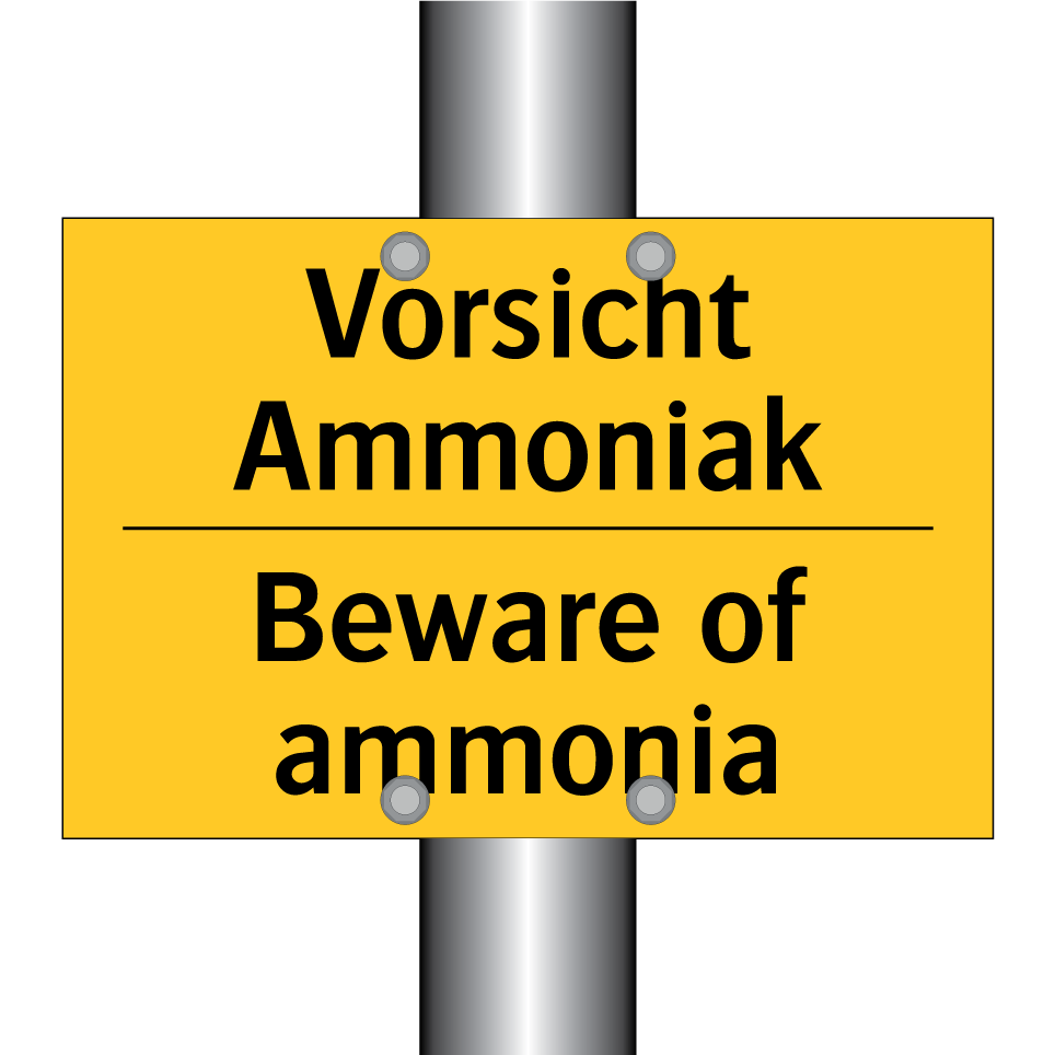 Zweisprachiges Warnschild mit deutschem Text Vorsicht Ammoniak und englischem Text Beware of ammonia