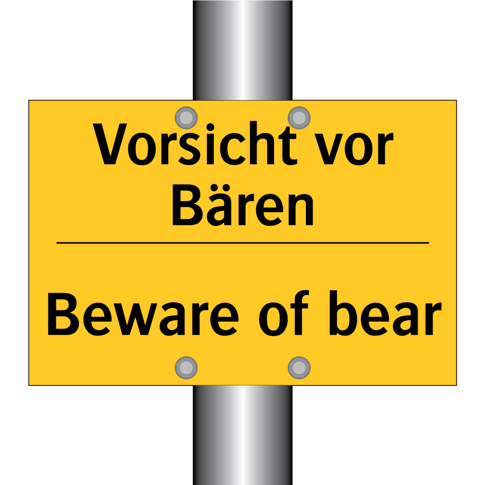 Zweisprachiges Warnschild mit deutschem Text Vorsicht vor Bären und englischem Text Beware of bear