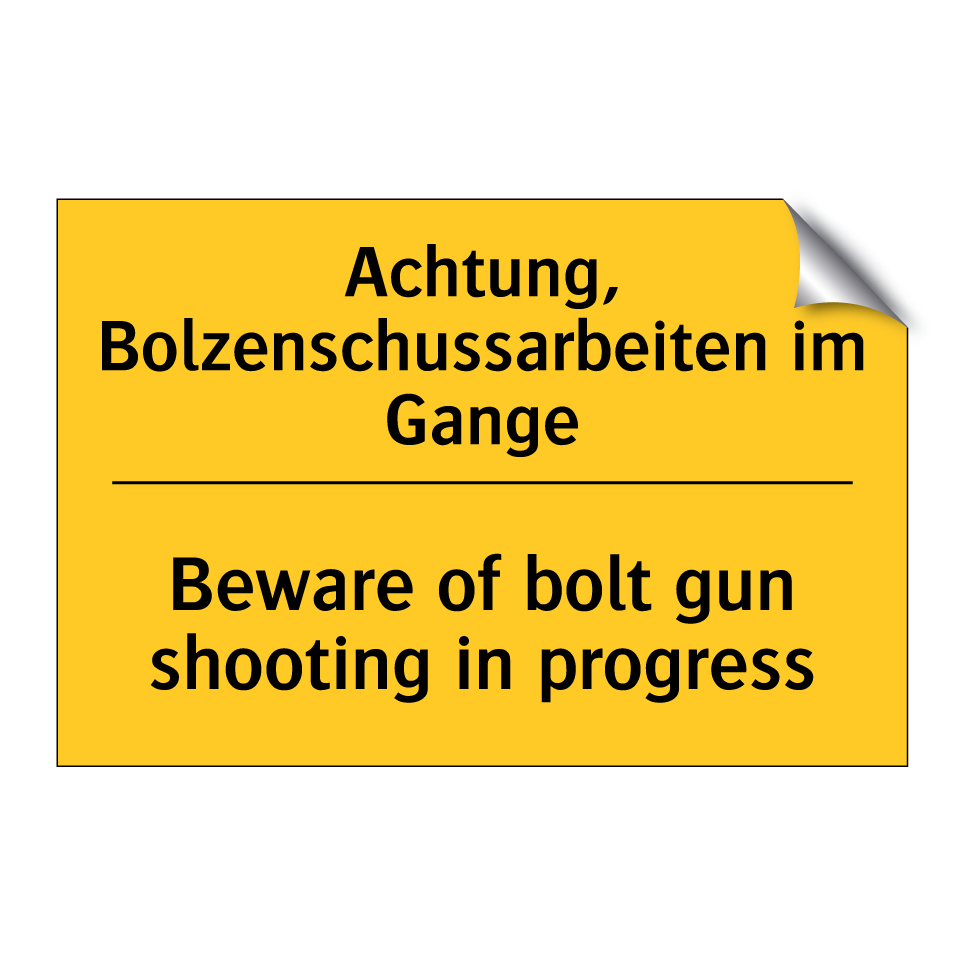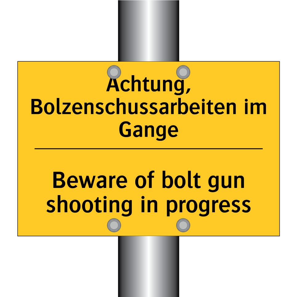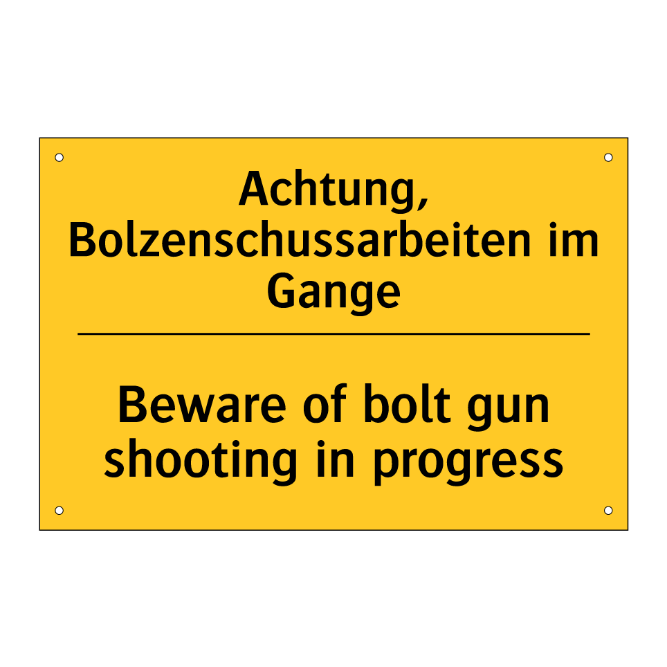 Zweisprachiges Warnschild mit deutschem Text Achtung, Bolzenschussarbeiten im Gange und englischem Text Beware of bolt gun shooting in progress