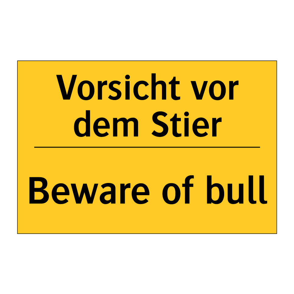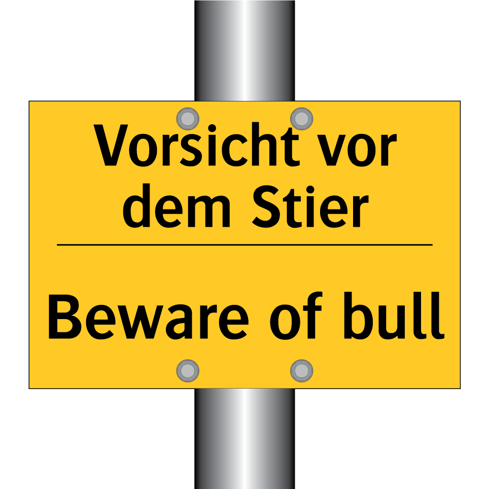 Zweisprachiges Warnschild mit deutschem Text Vorsicht vor dem Stier und englischem Text Beware of bull