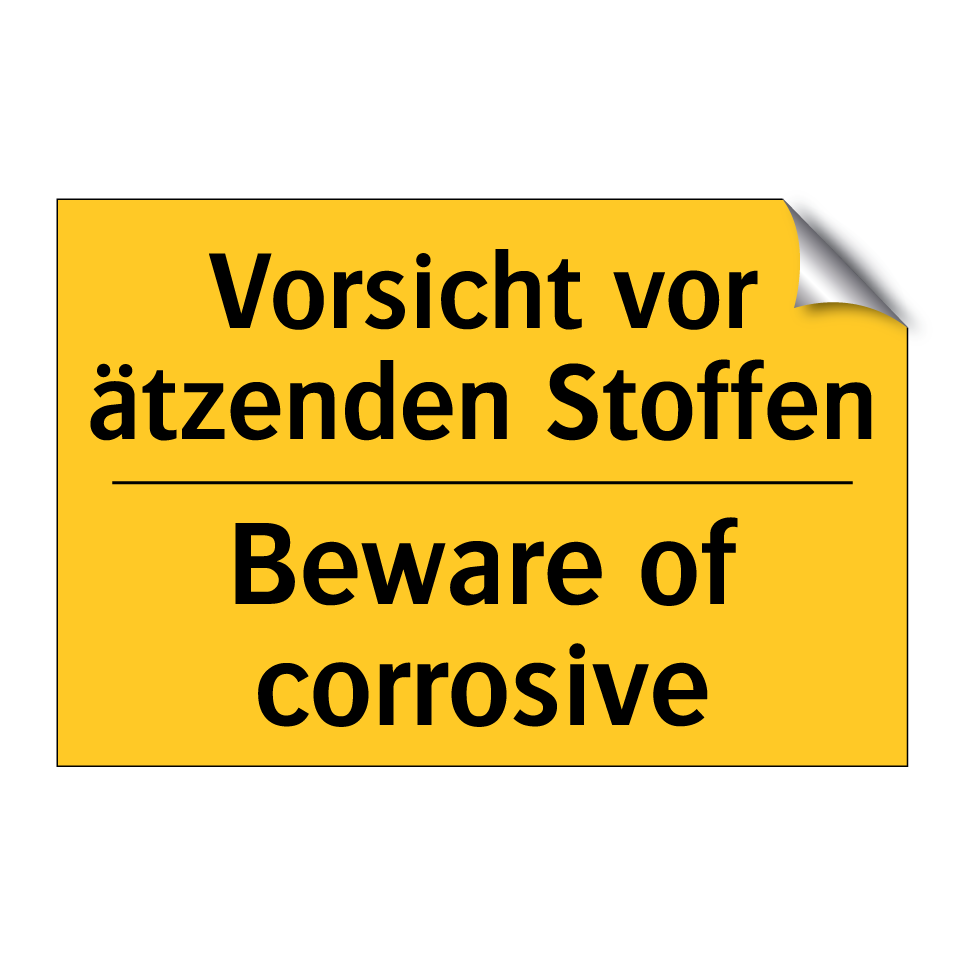 Zweisprachiges Warnschild mit deutschem Text Vorsicht vor ätzenden Stoffen und englischem Text Beware of corrosive