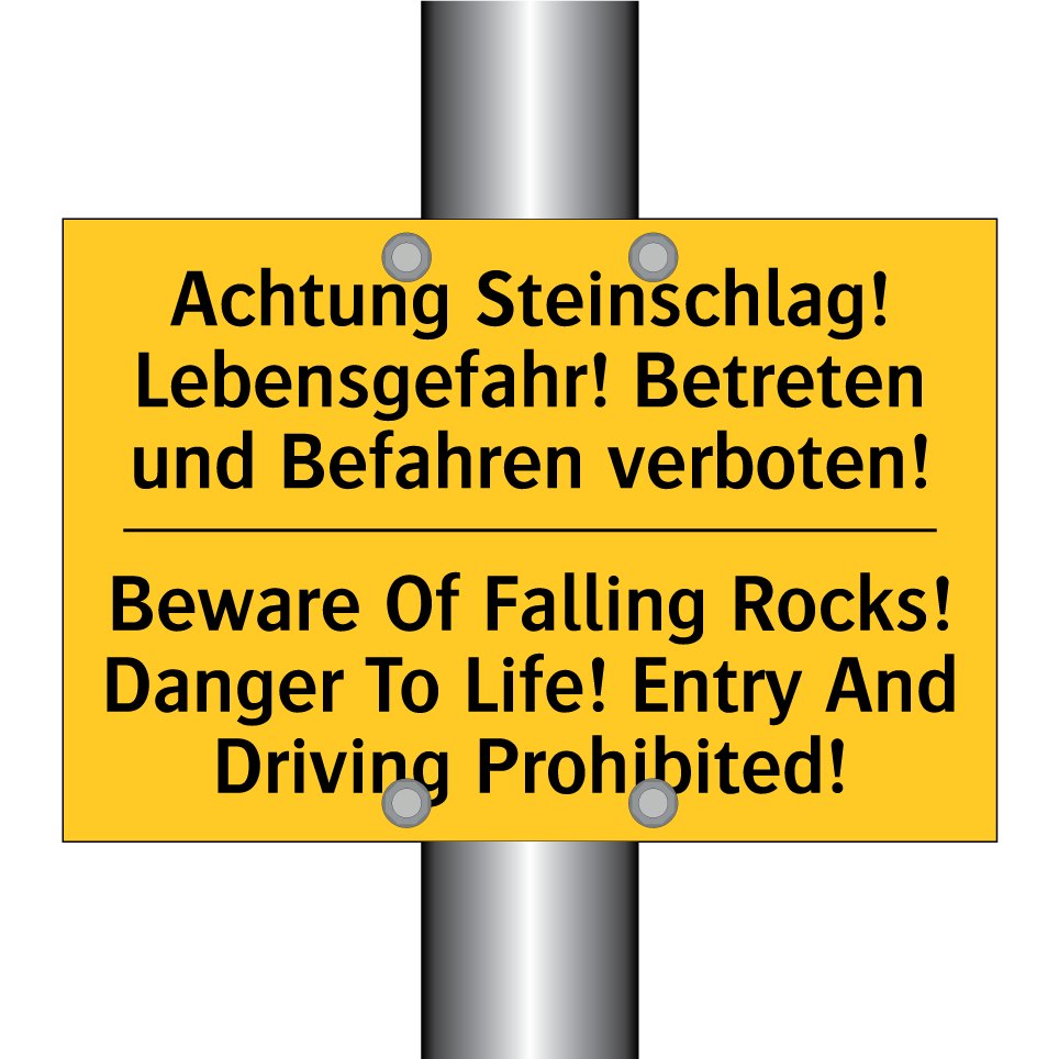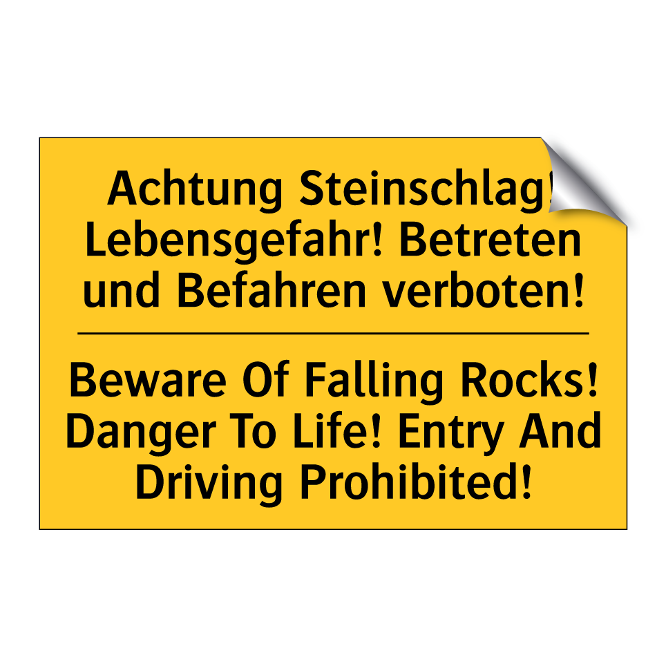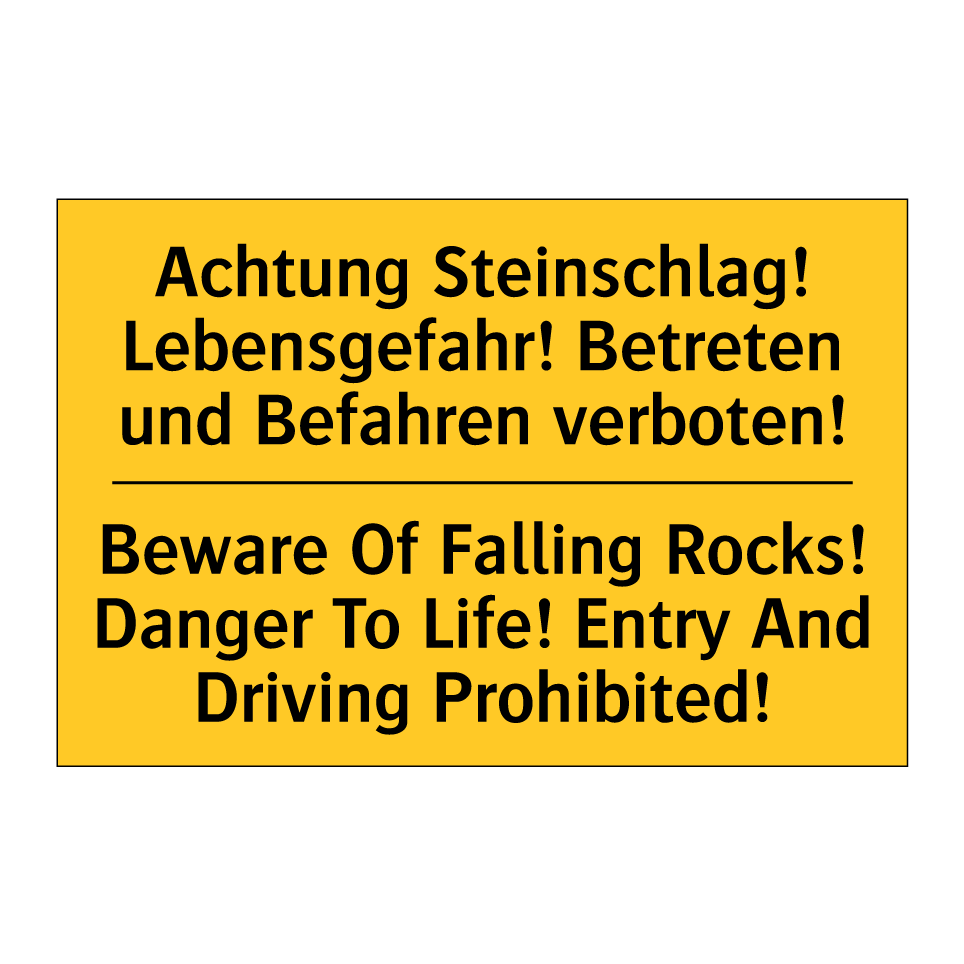 Zweisprachiges Warnschild mit deutschem Text Achtung Steinschlag! Lebensgefahr! Betreten und Befahren verboten! und englischem Text Beware Of Falling Rocks! Danger To Life! Entry And Driving Prohibited!
