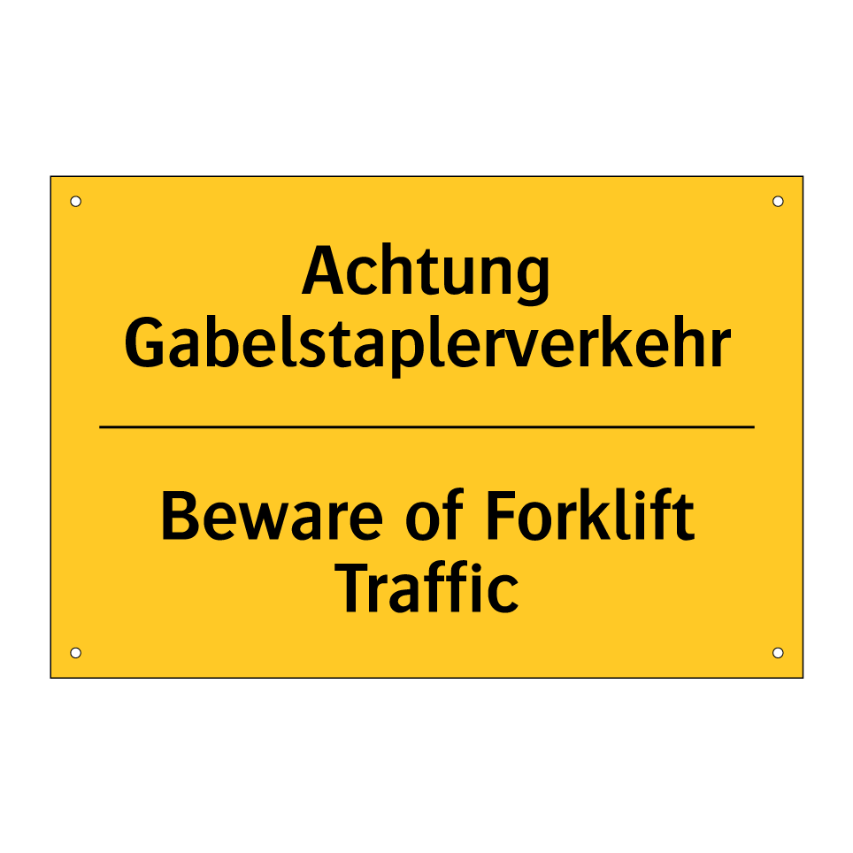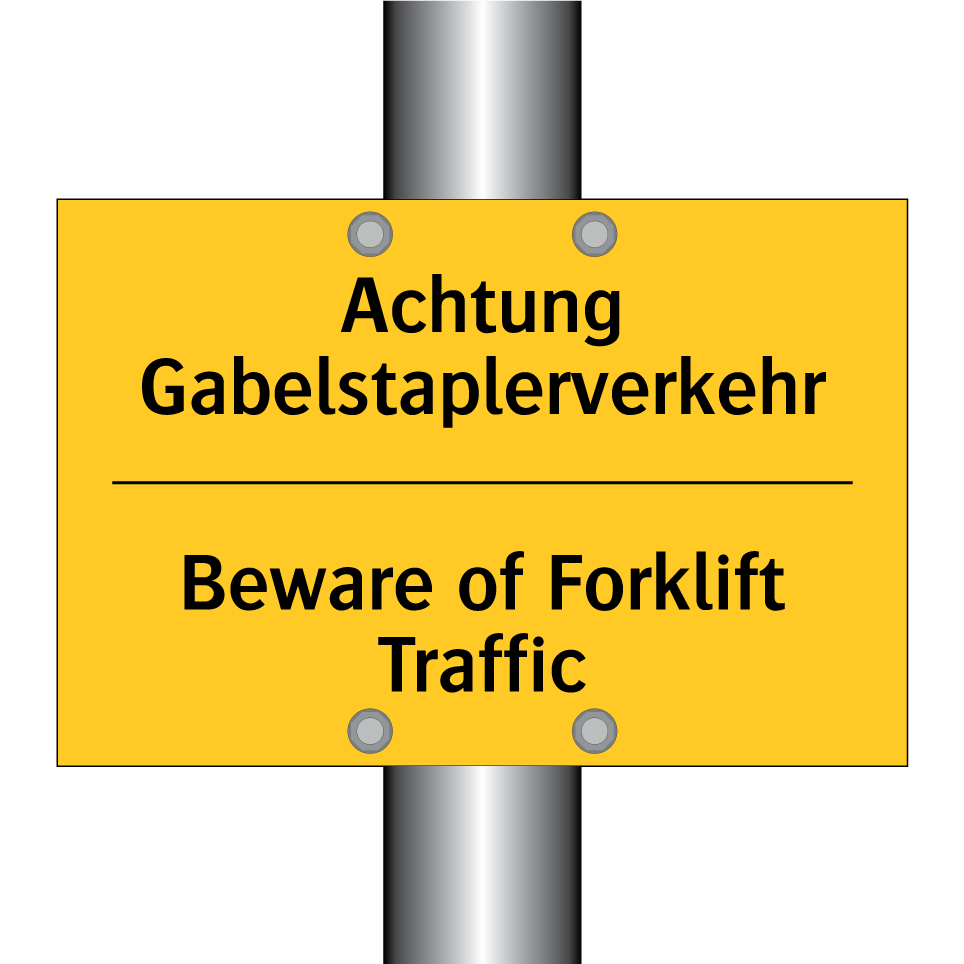 Zweisprachiges Warnschild mit deutschem Text Achtung Gabelstaplerverkehr und englischem Text Beware of Forklift Traffic