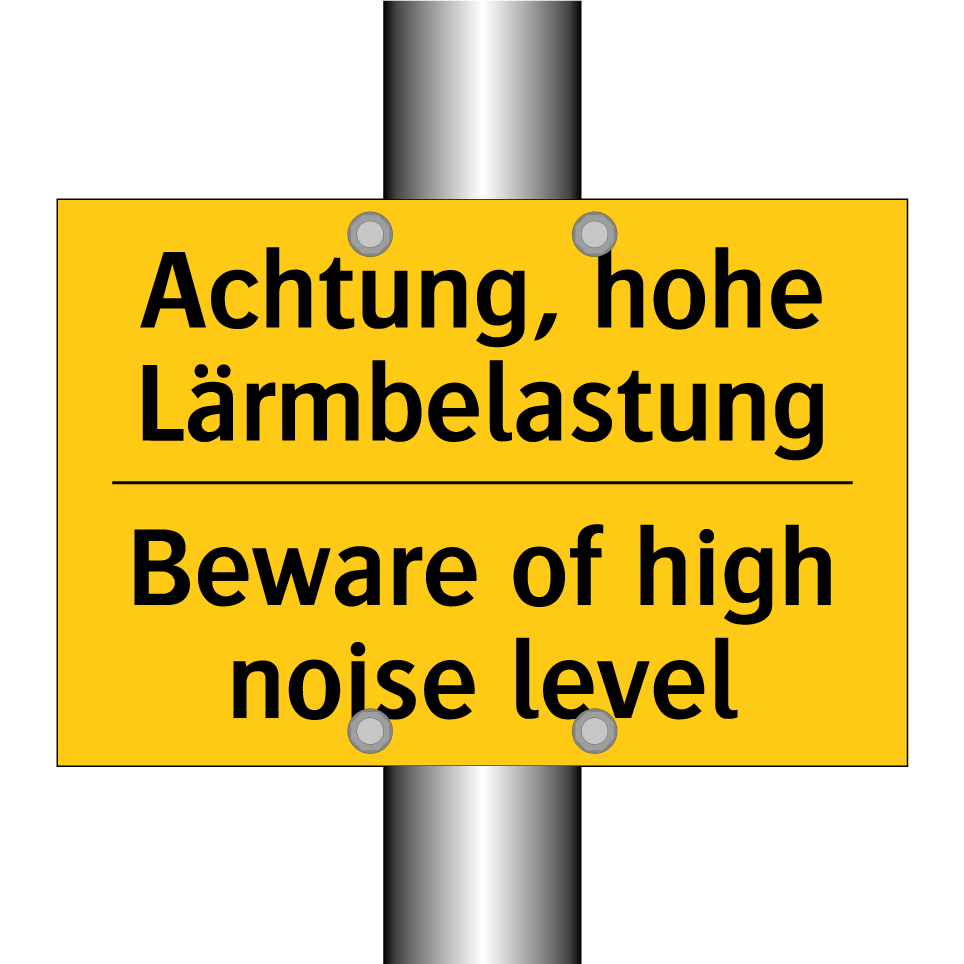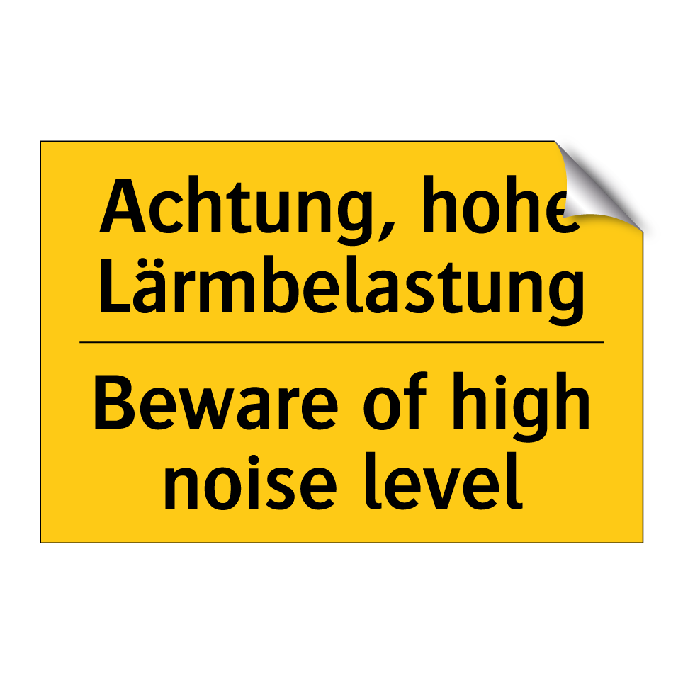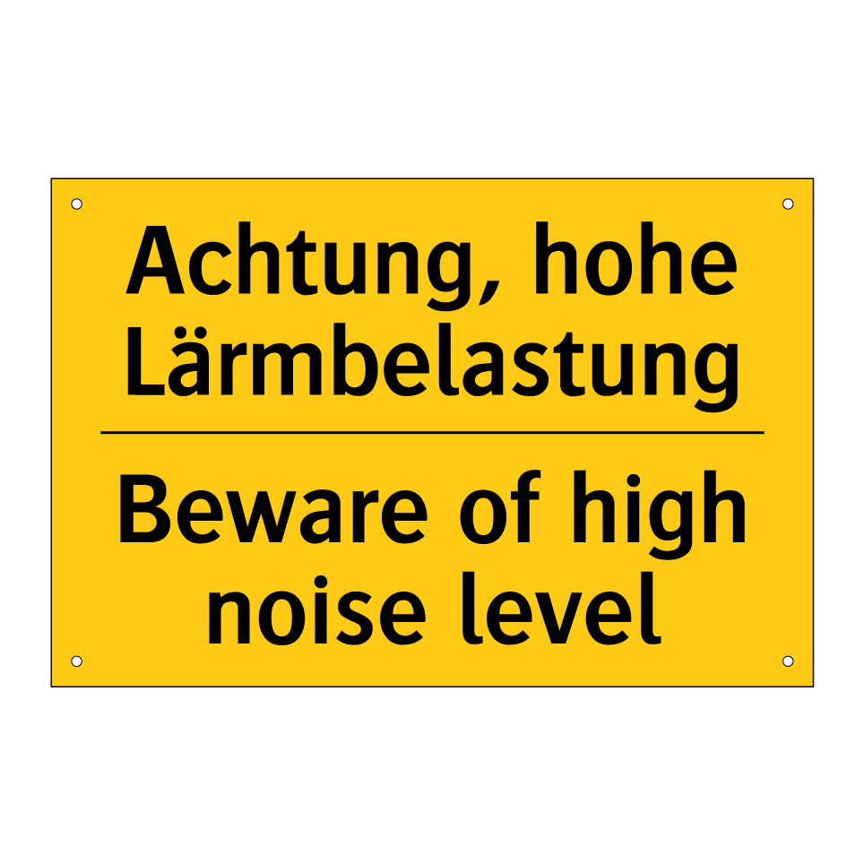 Zweisprachiges Warnschild mit deutschem Text Achtung, hohe Lärmbelastung und englischem Text Beware of high noise level