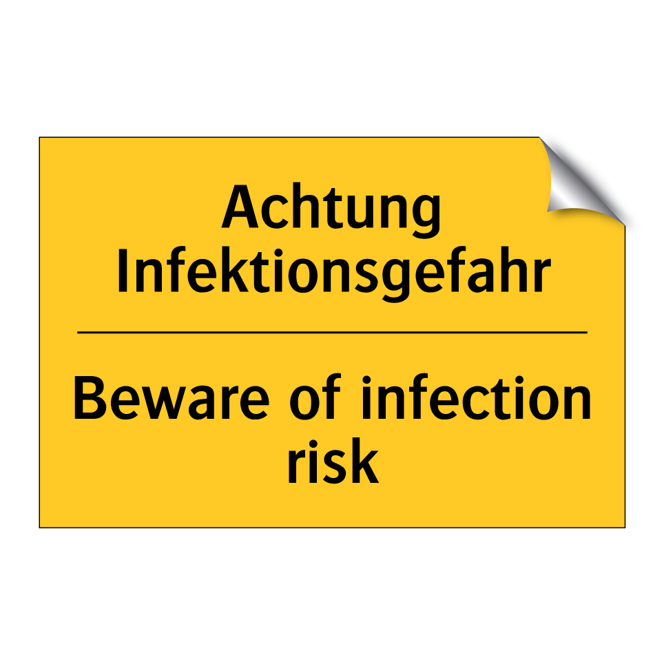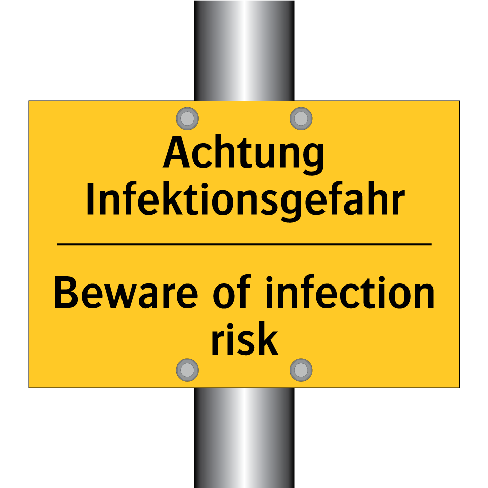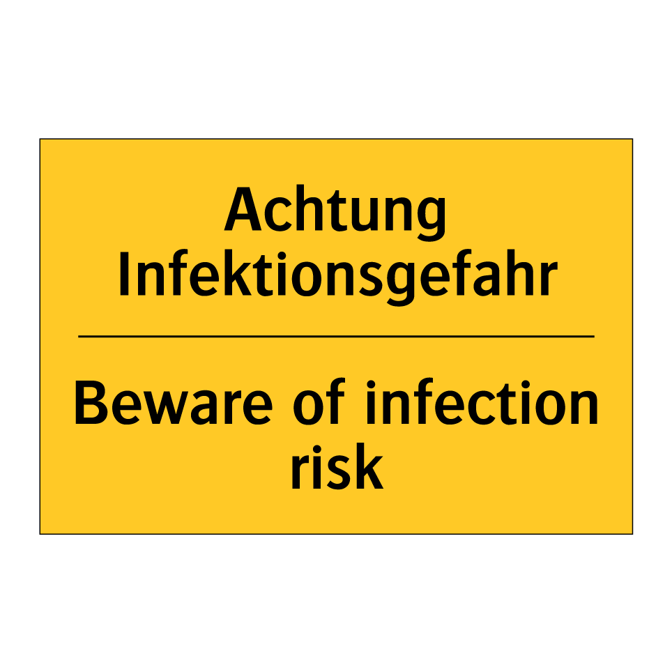 Zweisprachiges Warnschild mit deutschem Text Achtung Infektionsgefahr und englischem Text Beware of infection risk