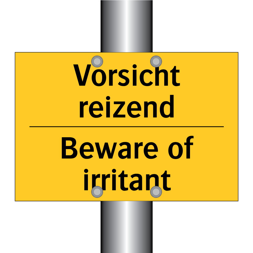 Zweisprachiges Warnschild mit deutschem Text Vorsicht reizend und englischem Text Beware of irritant
