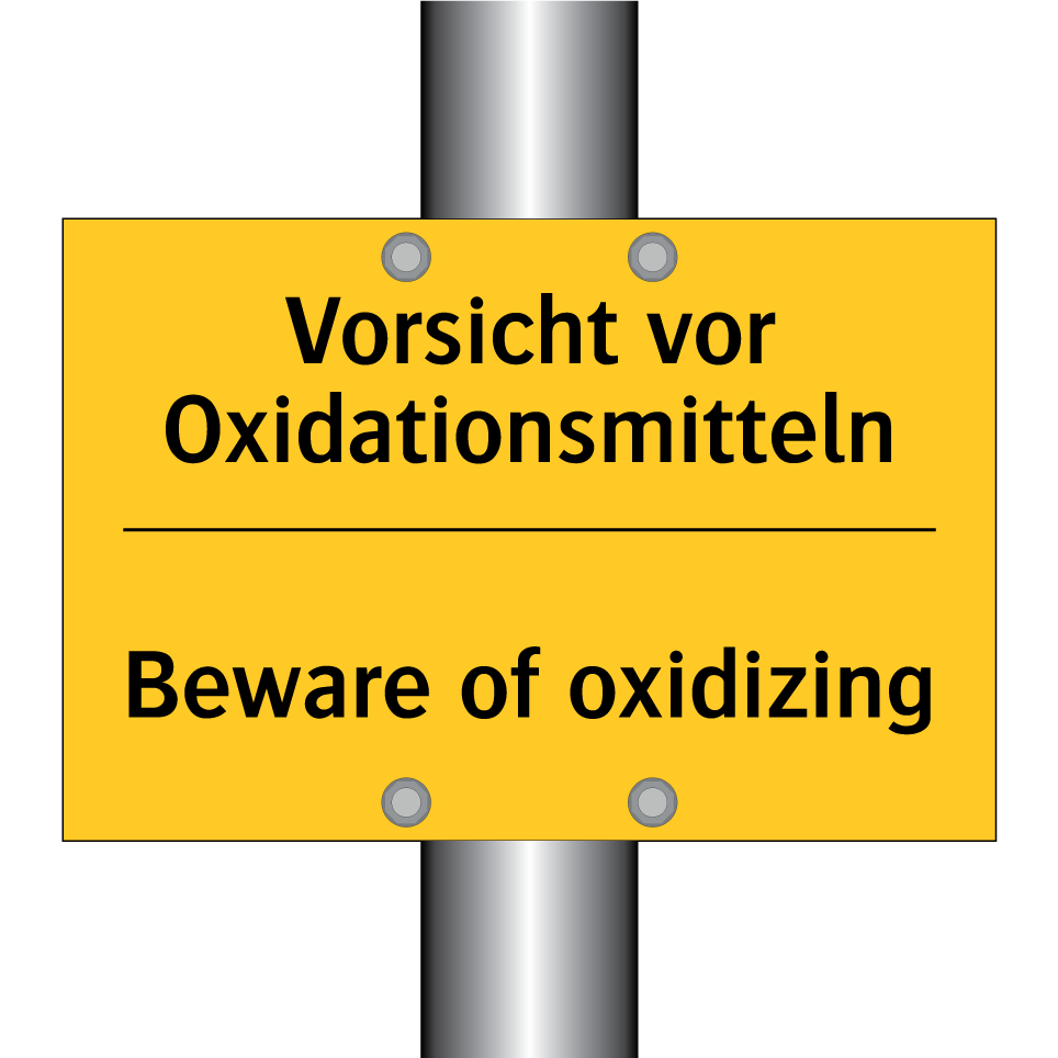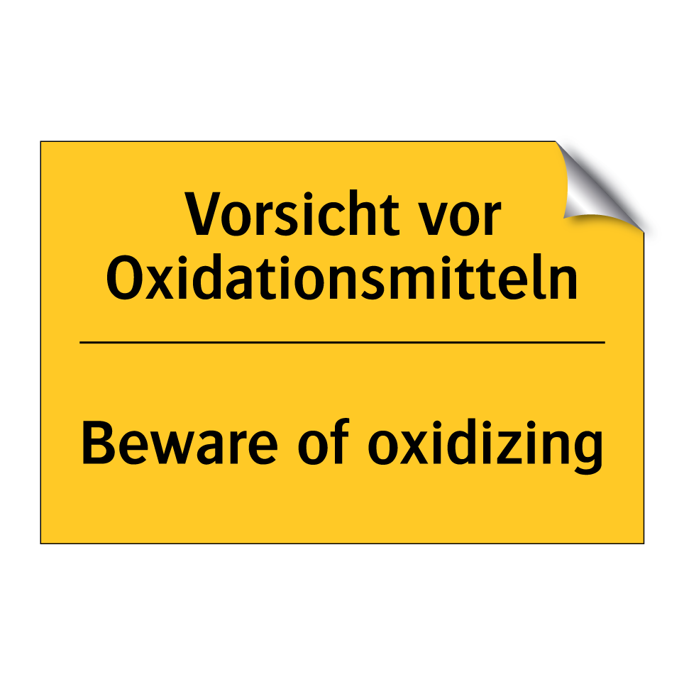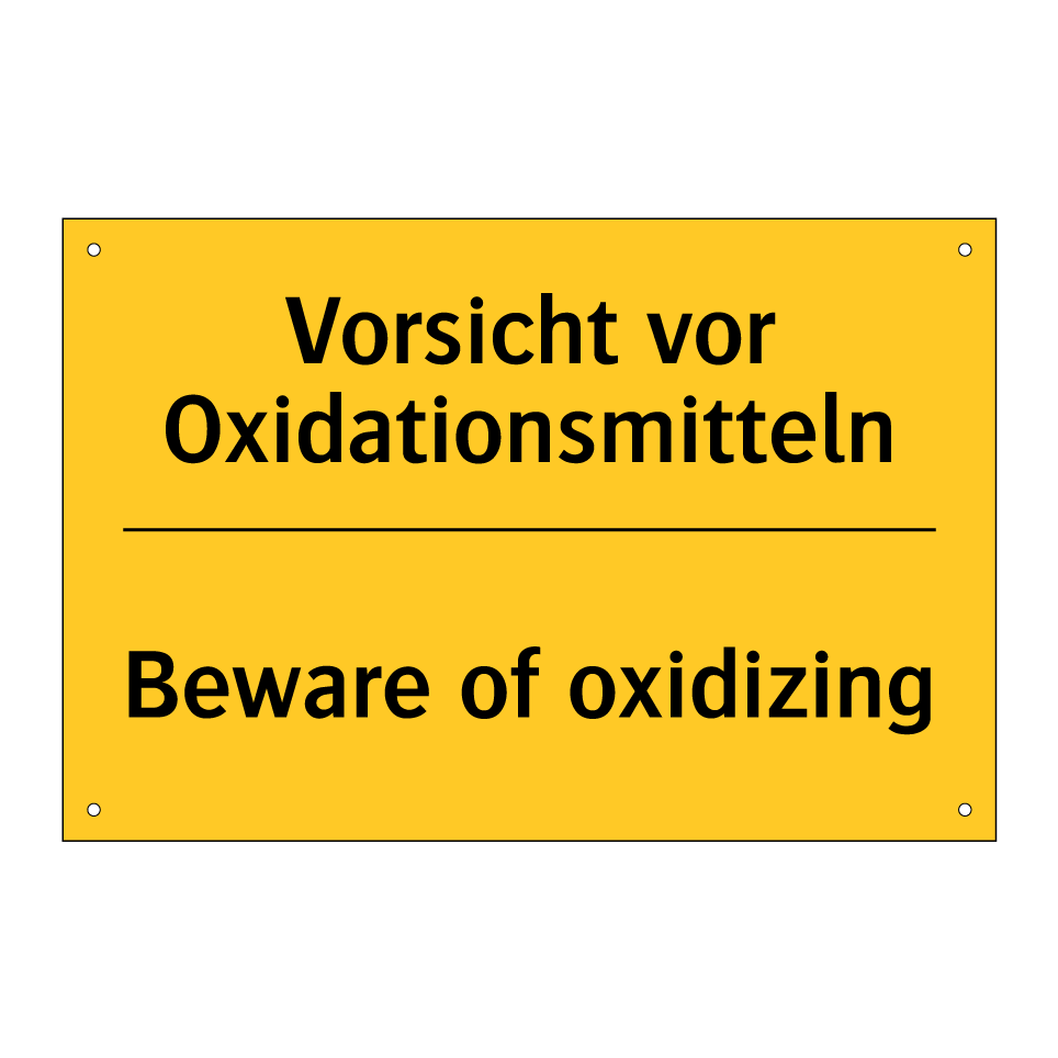 Zweisprachiges Warnschild mit deutschem Text Vorsicht vor Oxidationsmitteln und englischem Text Beware of oxidizing