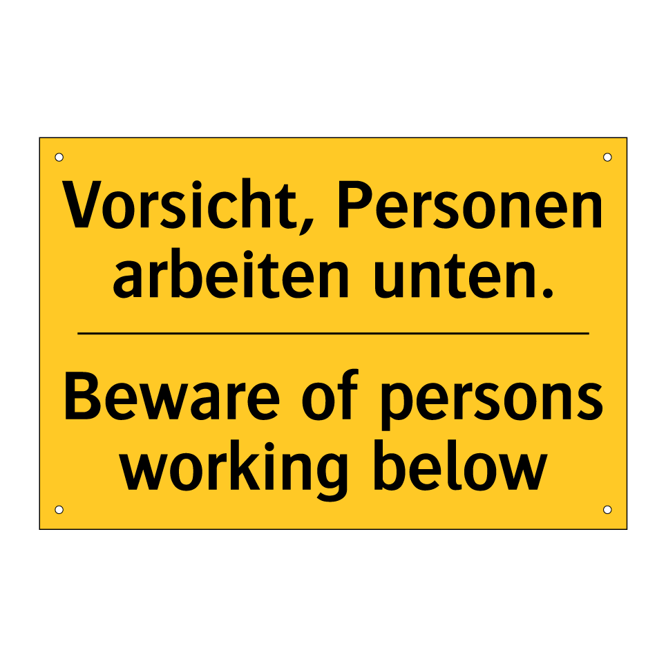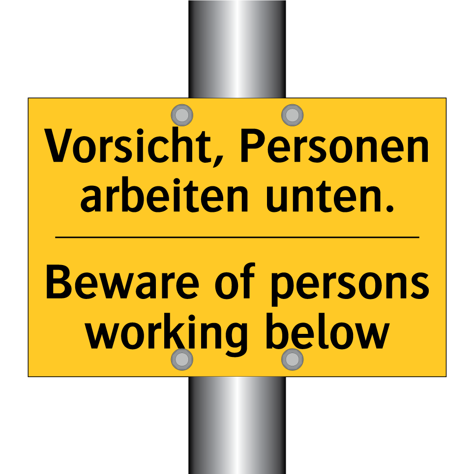 Zweisprachiges Warnschild mit deutschem Text Vorsicht, Personen arbeiten unten. und englischem Text Beware of persons working below