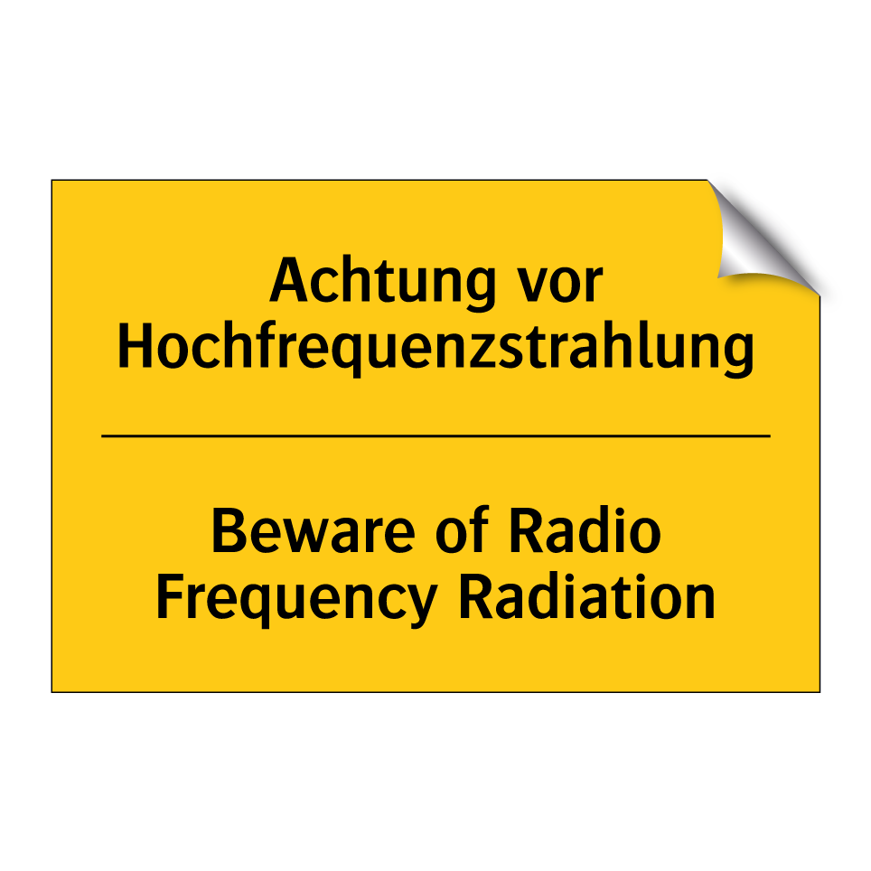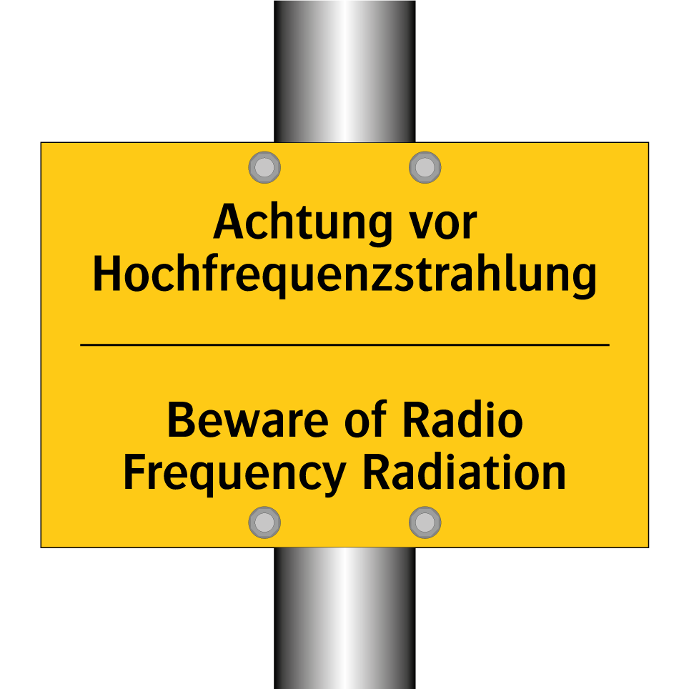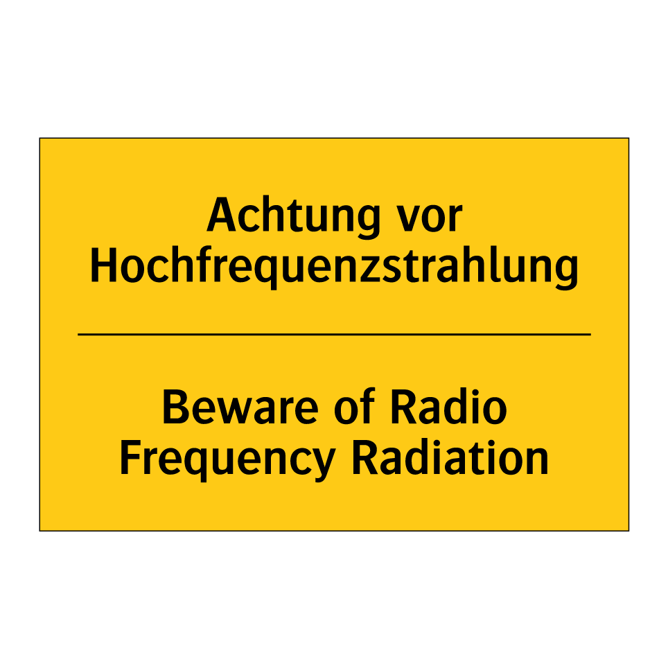 Zweisprachiges Warnschild mit deutschem Text Achtung vor Hochfrequenzstrahlung und englischem Text Beware of Radio Frequency Radiation