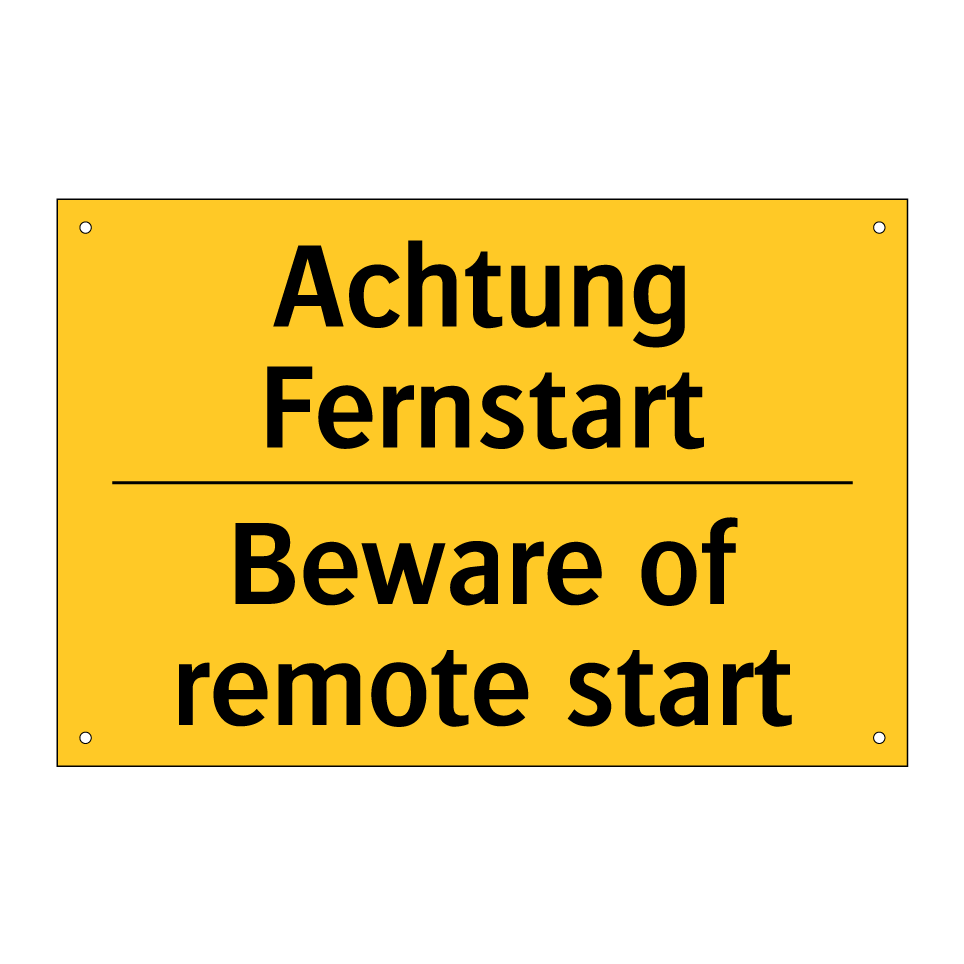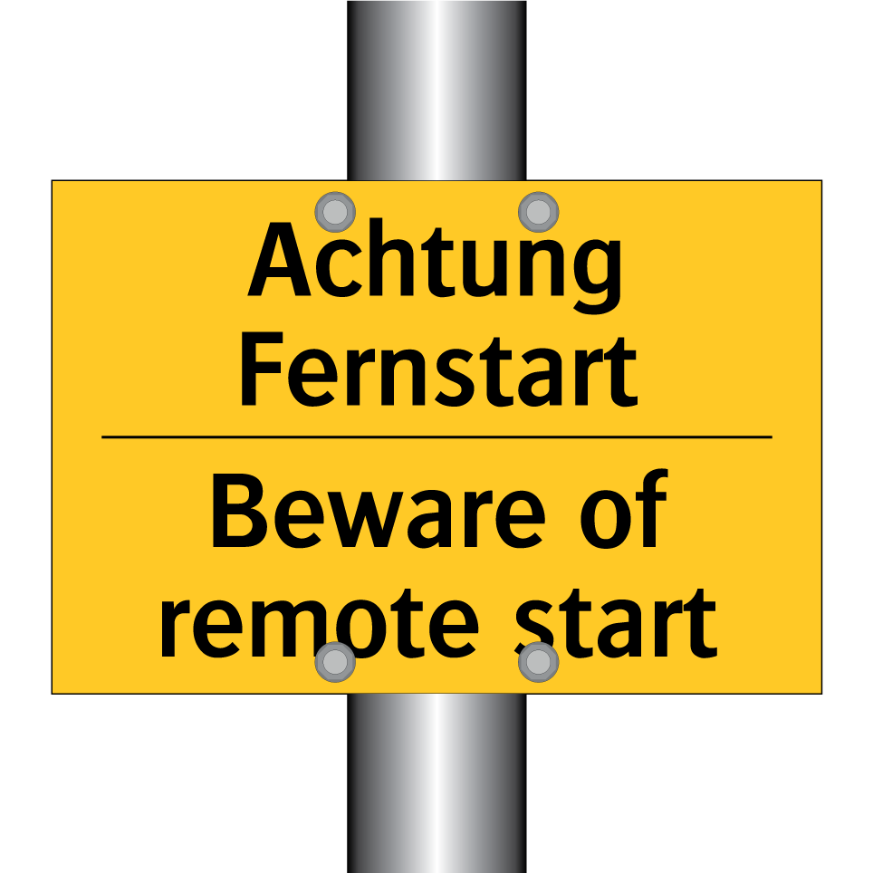 Zweisprachiges Warnschild mit deutschem Text Achtung Fernstart und englischem Text Beware of remote start