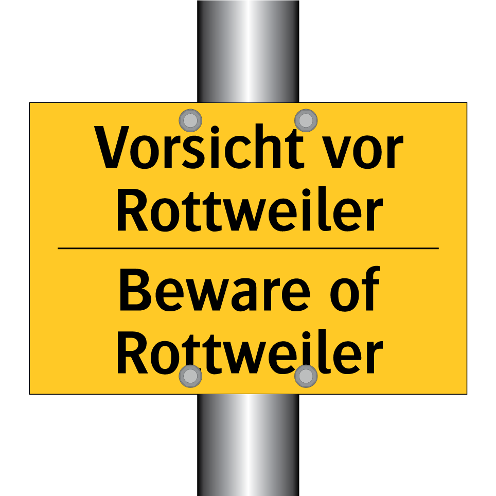 Zweisprachiges Warnschild mit deutschem Text Vorsicht vor Rottweiler und englischem Text Beware of Rottweiler