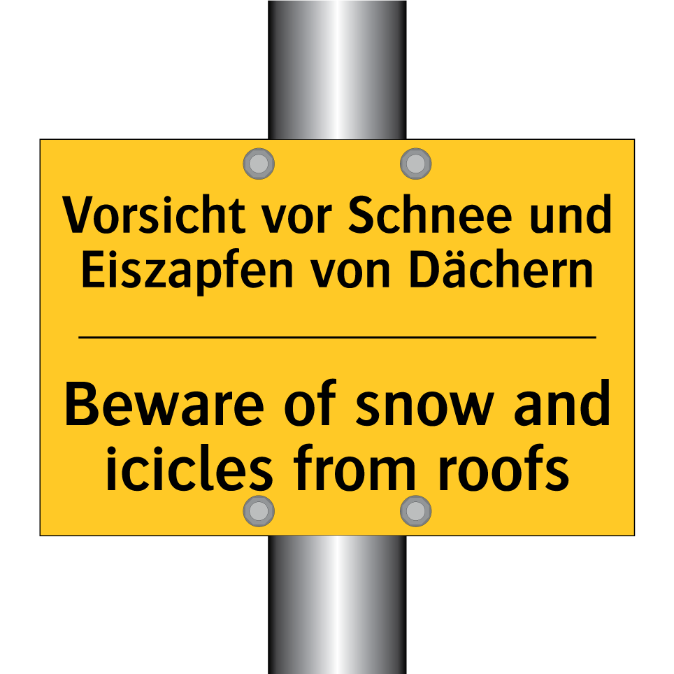Zweisprachiges Warnschild mit deutschem Text Vorsicht vor Schnee und Eiszapfen von Dächern und englischem Text Beware of snow and icicles from roofs