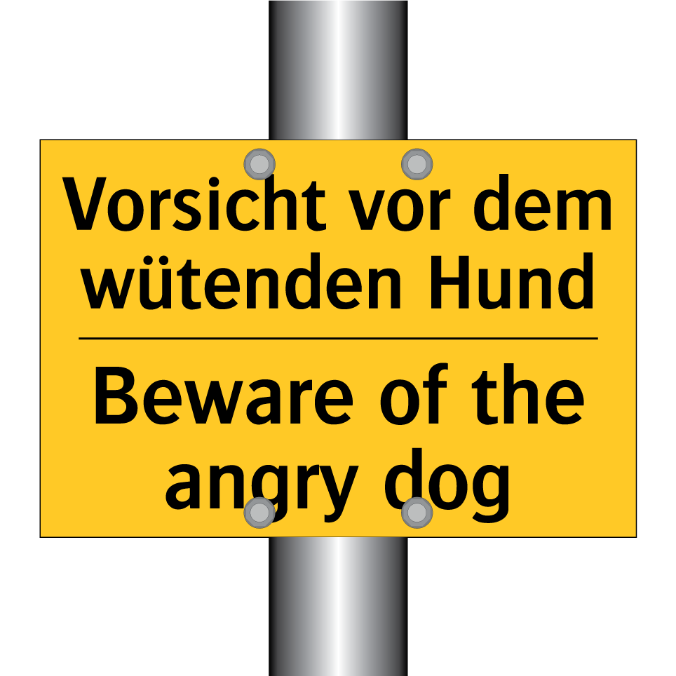 Zweisprachiges Warnschild mit deutschem Text Vorsicht vor dem wütenden Hund und englischem Text Beware of the angry dog