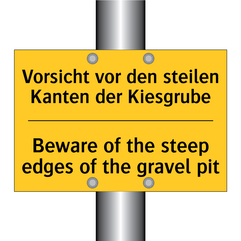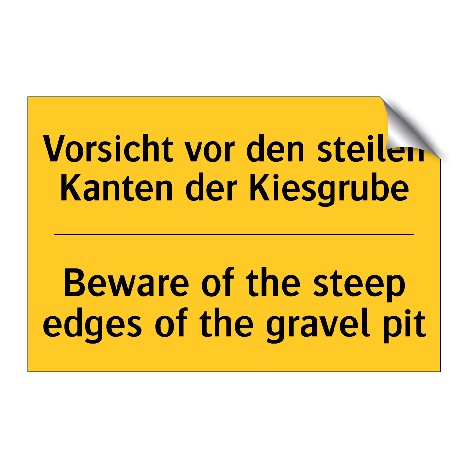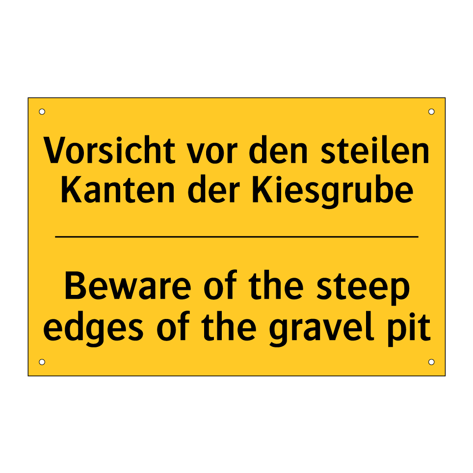 Zweisprachiges Warnschild mit deutschem Text Vorsicht vor den steilen Kanten der Kiesgrube und englischem Text Beware of the steep edges of the gravel pit