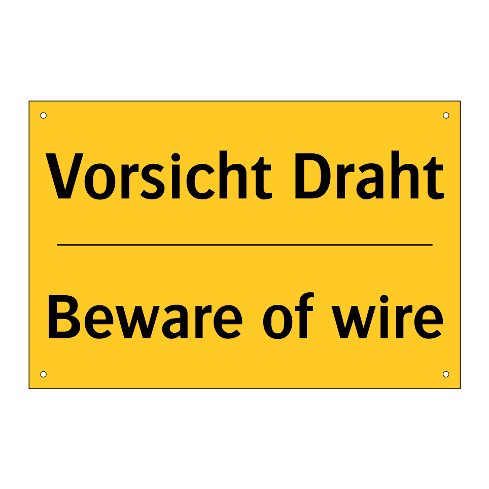 Zweisprachiges Warnschild mit deutschem Text Vorsicht Draht und englischem Text Beware of wire