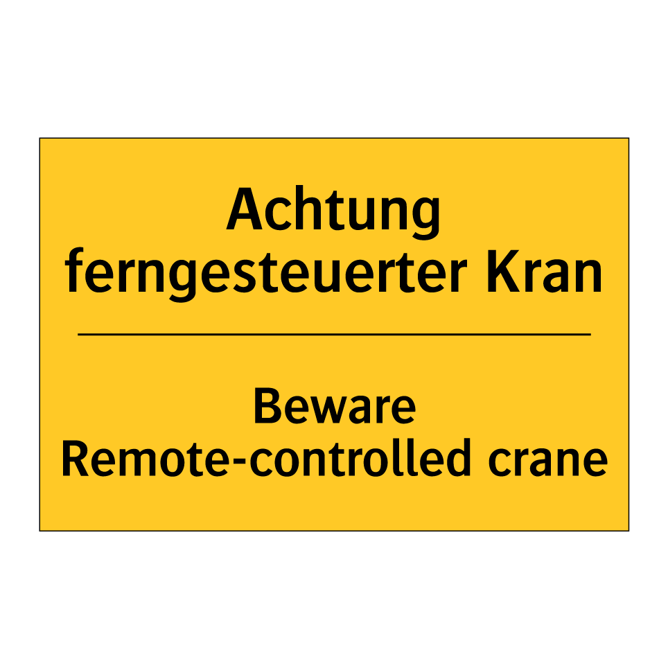 Zweisprachiges Warnschild mit deutschem Text Achtung ferngesteuerter Kran und englischem Text Beware Remote-controlled crane