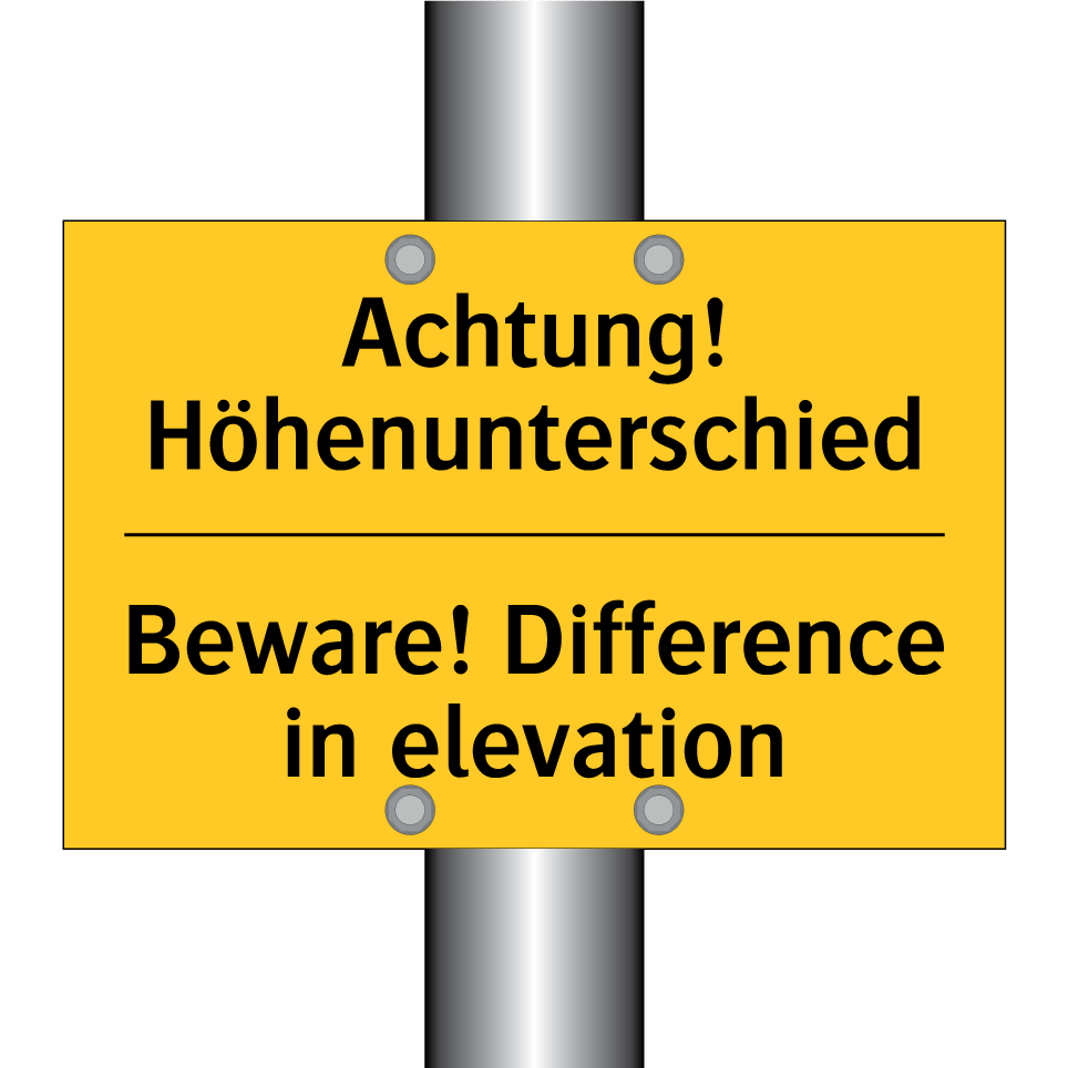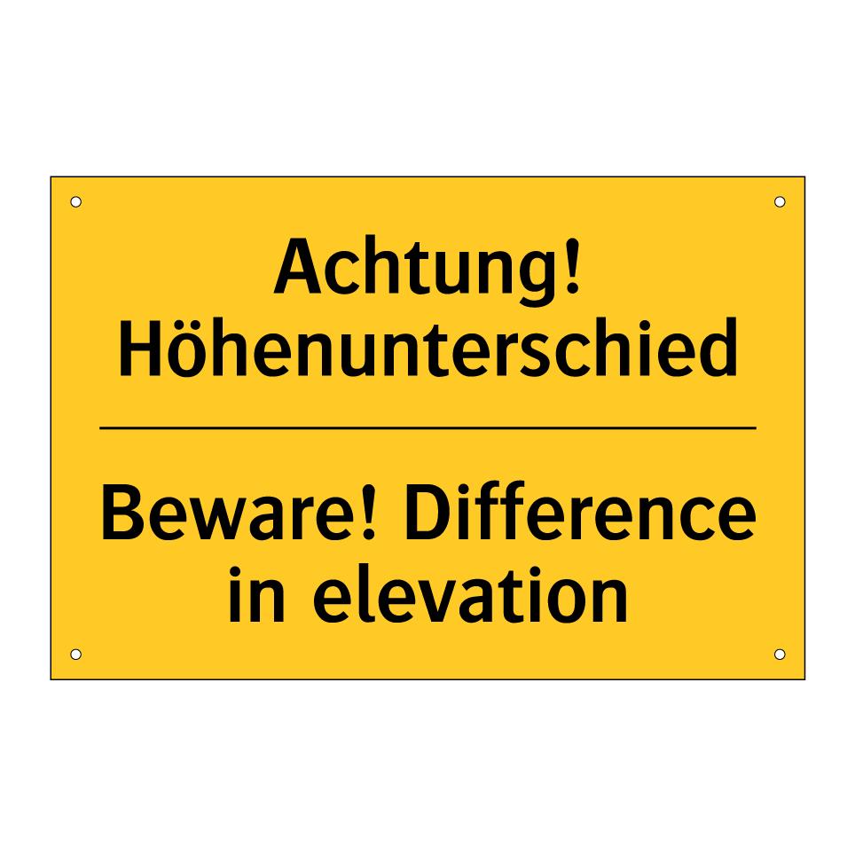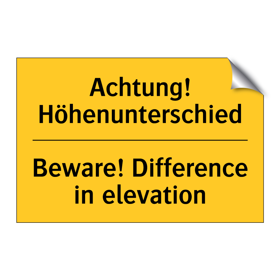 Zweisprachiges Warnschild mit deutschem Text Achtung! Höhenunterschied und englischem Text Beware! Difference in elevation