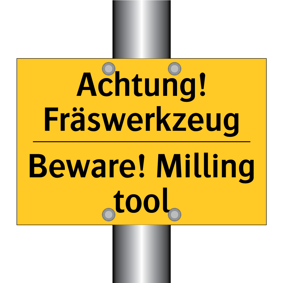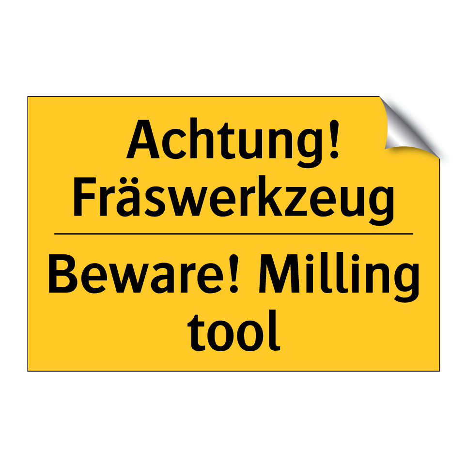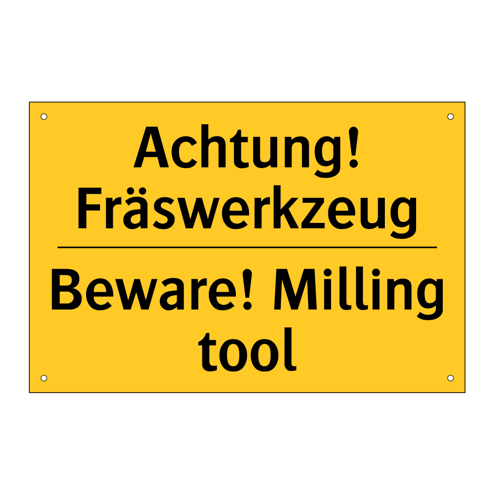 Zweisprachiges Warnschild mit deutschem Text Achtung! Fräswerkzeug und englischem Text Beware! Milling tool