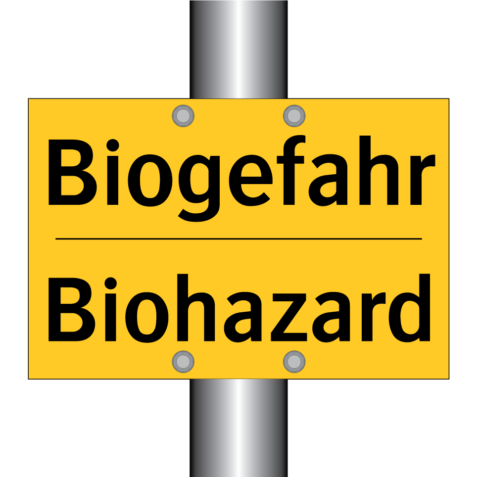 Zweisprachiges Warnschild mit deutschem Text Biogefahr und englischem Text Biohazard