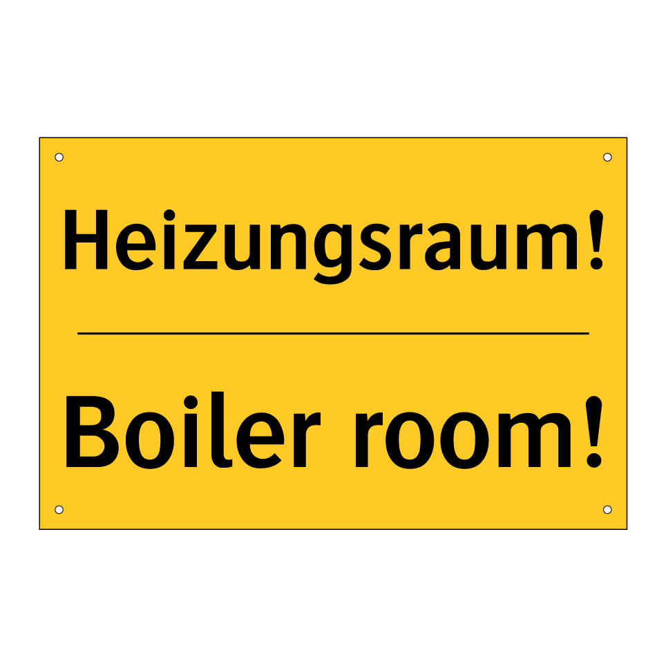 Zweisprachiges Warnschild mit deutschem Text Heizungsraum! und englischem Text Boiler room!